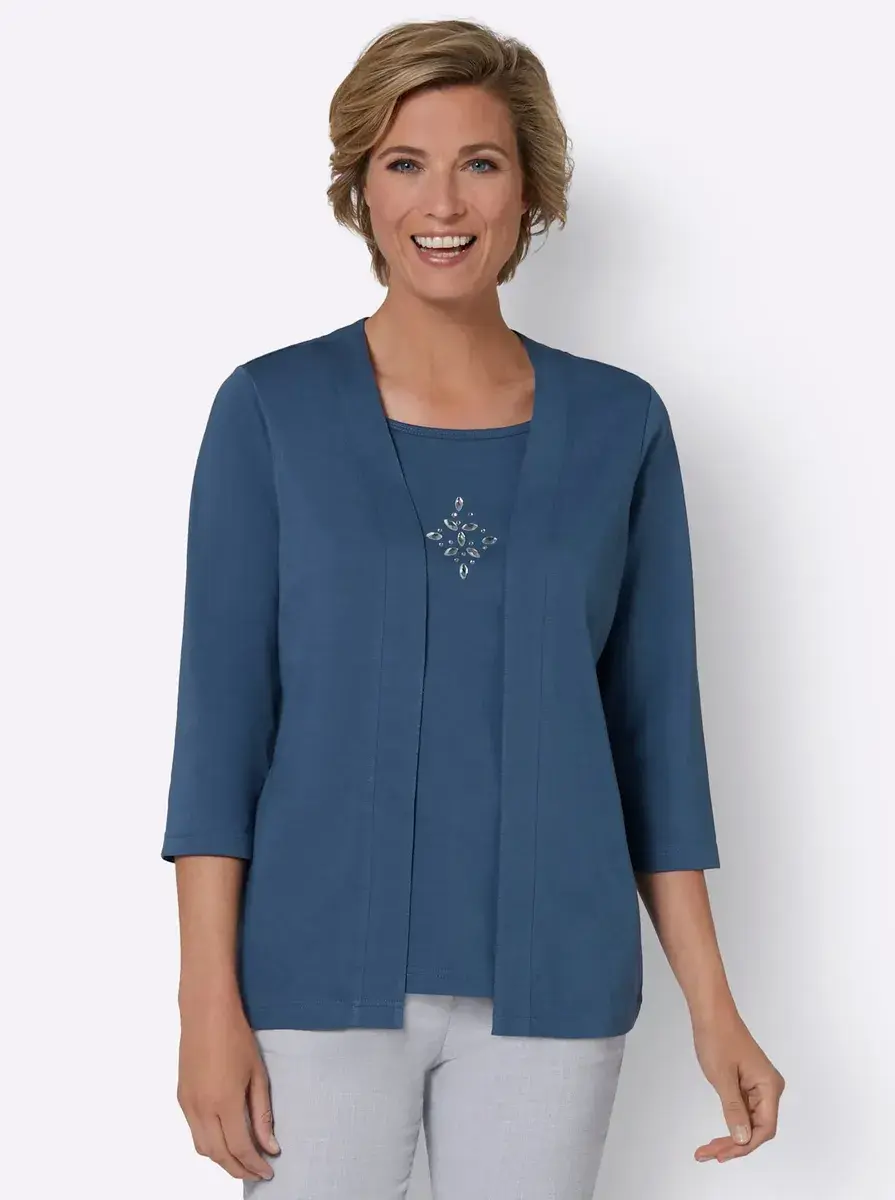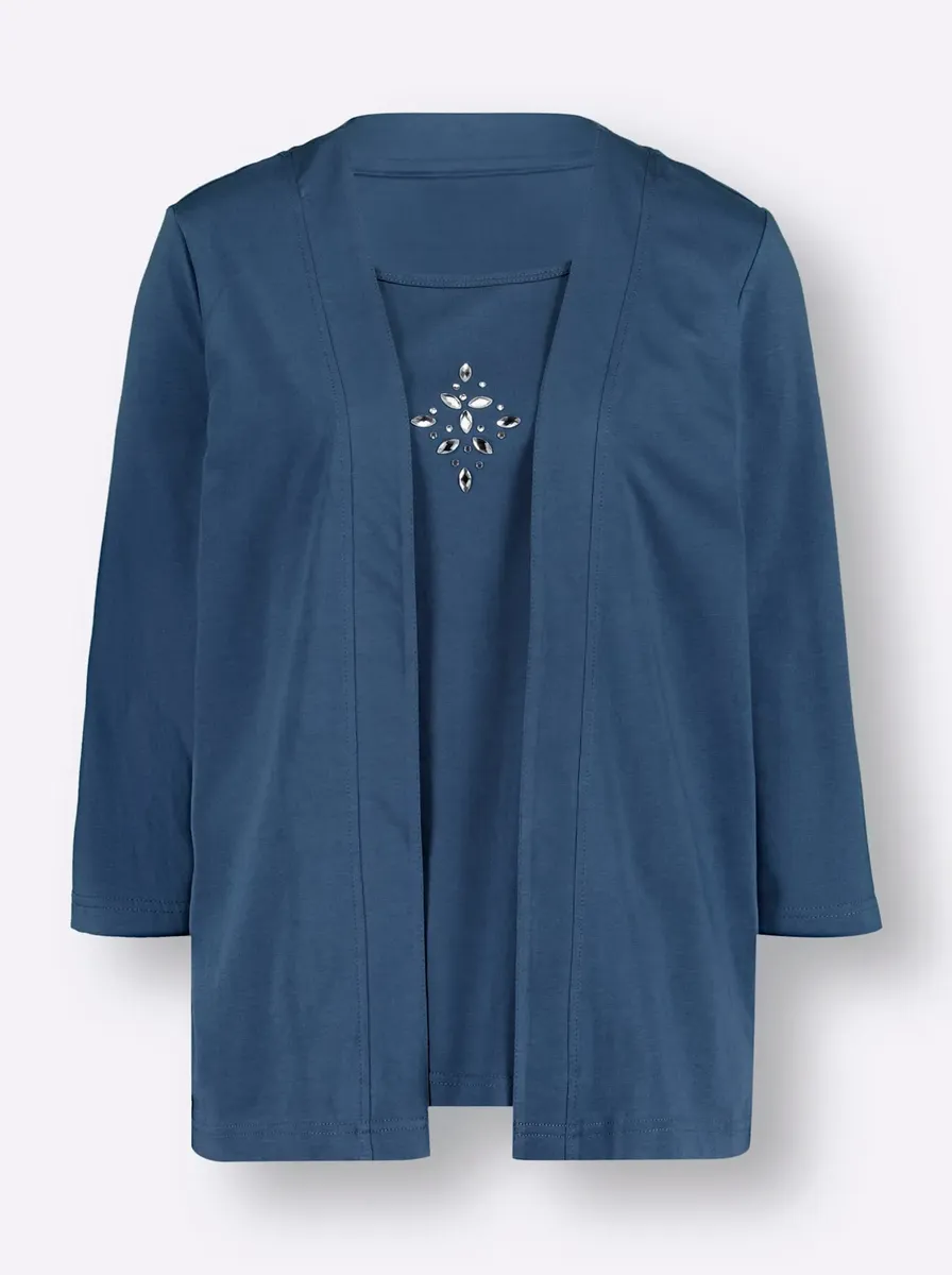 С этой многослойной рубашкой 2-в-1 вы всегда будете хорошо одеты. Декоративные камни ниже линии декольте. С рукавом 3/4. 100% хлопок. Машинная стирка.
