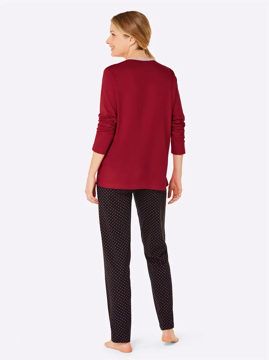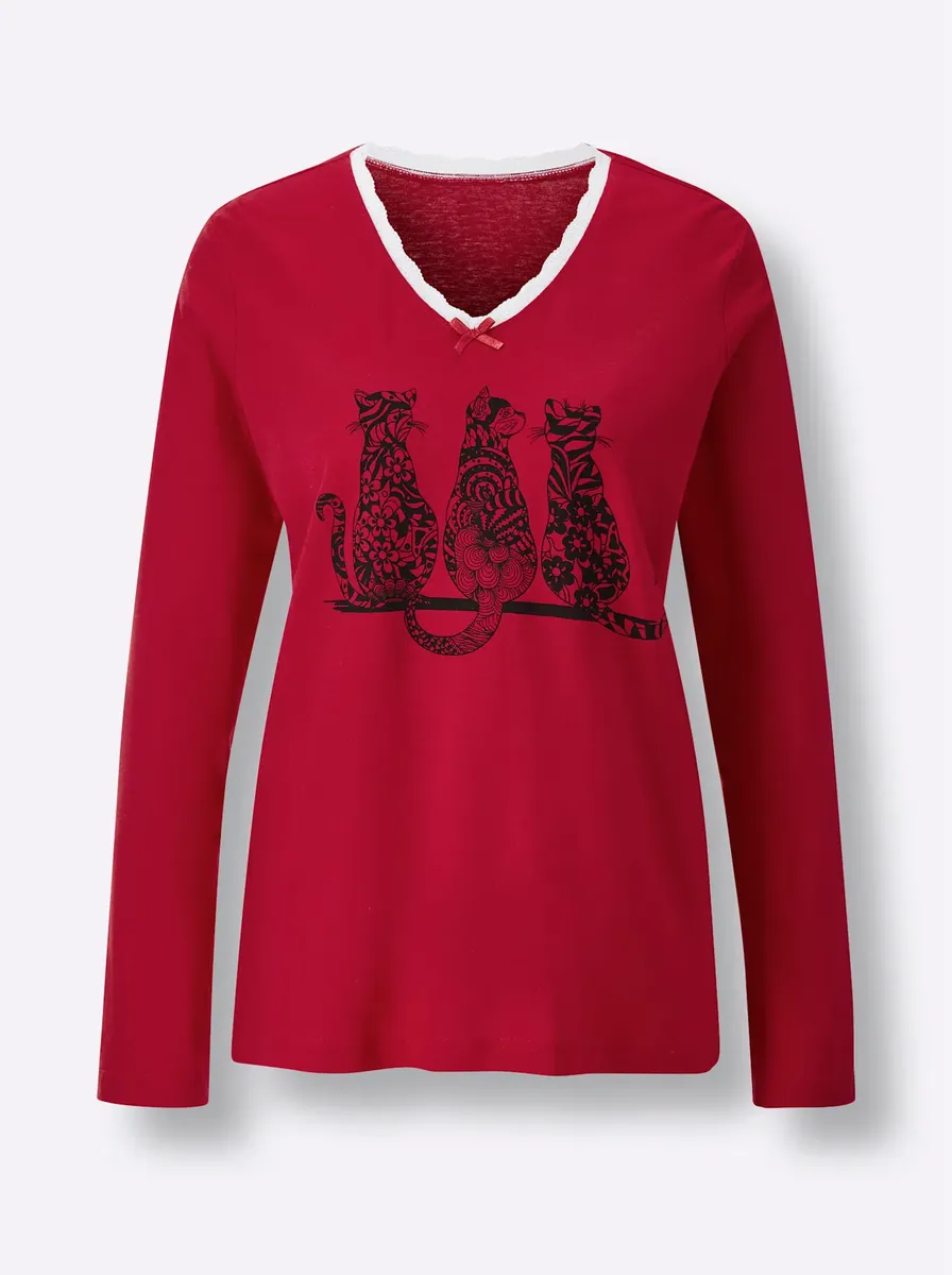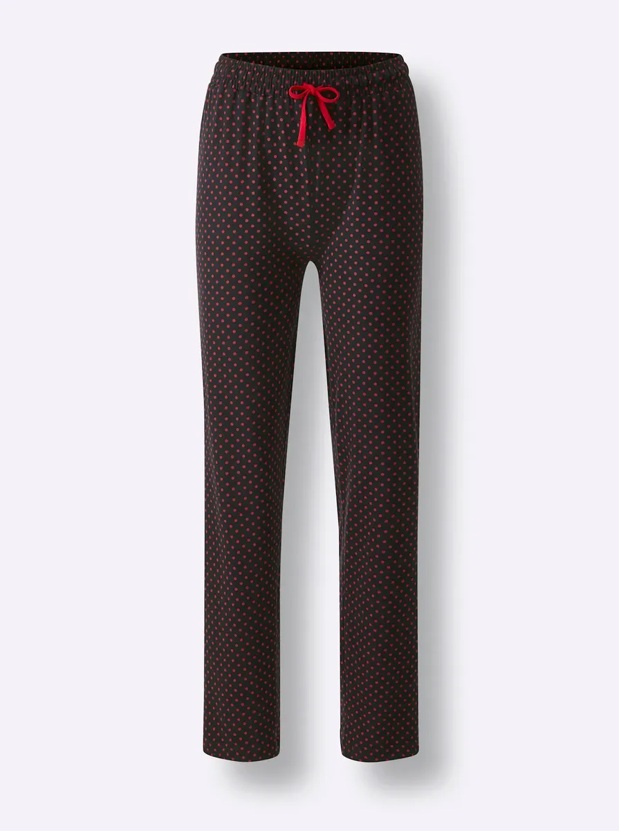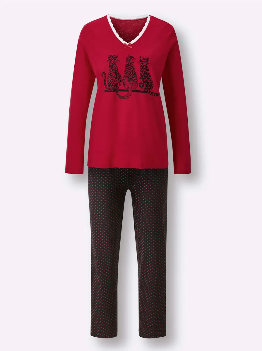 Полное количество баллов получено! Пижама с принтом в горошек. Спереди размещен мотив кошки. Длинные брюки с рисунком по всей поверхности, эластичным поясом с завязкой. Одинарный трикотаж. Поддержите инициативу «Хлопок, сделанный в Африке». 50% хлопок, 50% вискоза.
