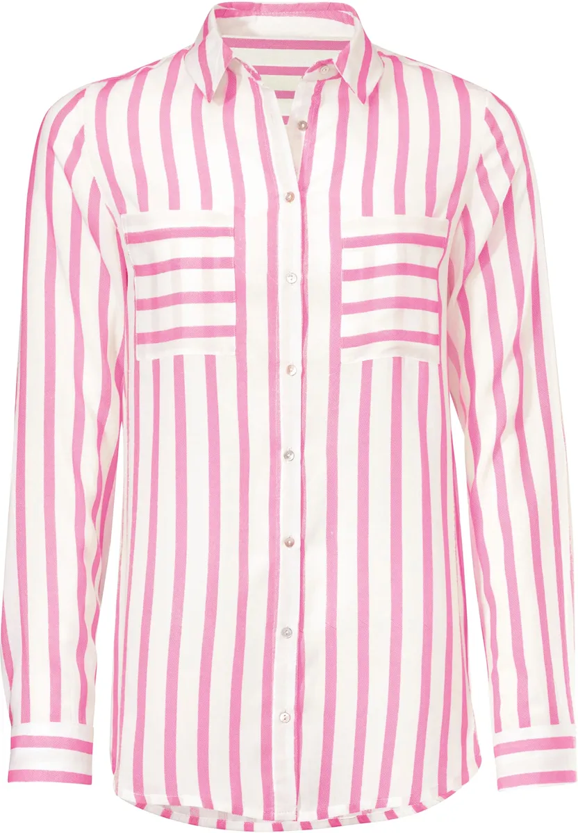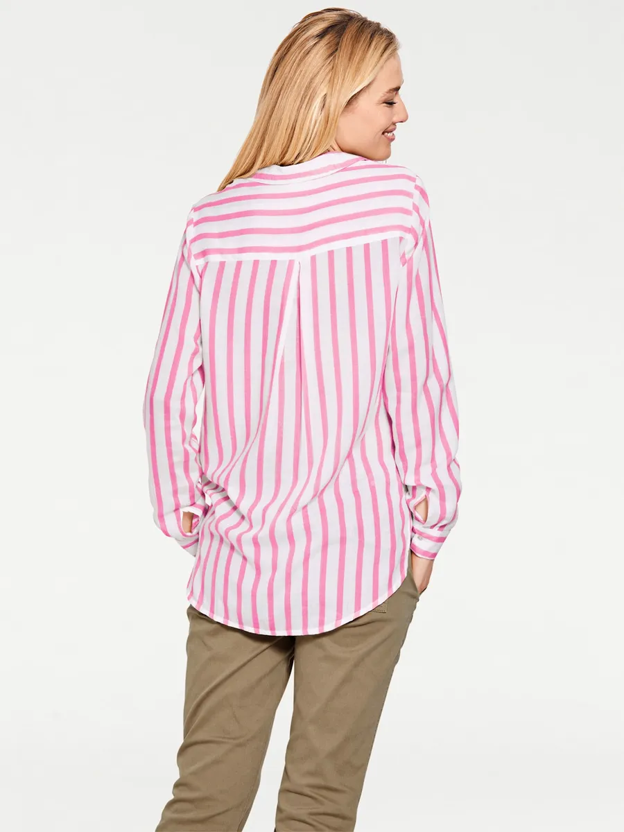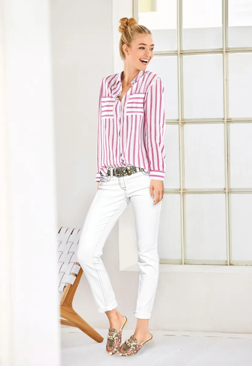 Полосатая блузка, современный повседневный образ. Товары, простые в уходе. Облегающая фигуру форма. 100% вискоза. Машинная стирка.