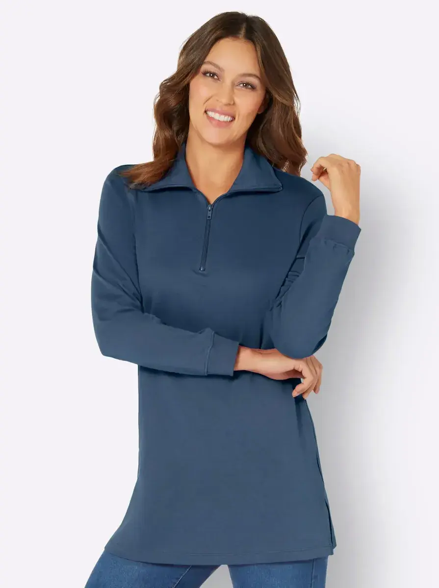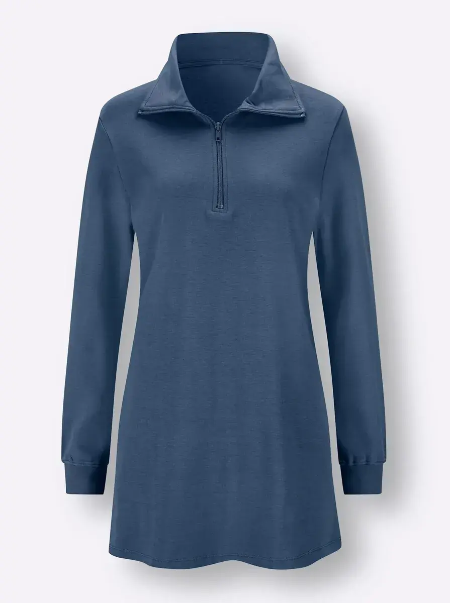 Удобная и стабильная по размеру длинная толстовка из материала интерлок. Отложной воротник можно заменить на воротник-стойку благодаря застежке-молнии. Длинные рукава с ребристыми манжетами. Боковые разрезы дают большую свободу движений. 100% хлопок. Машинная стирка.