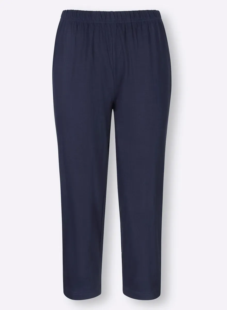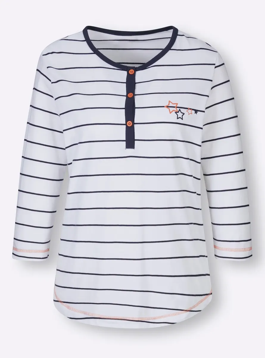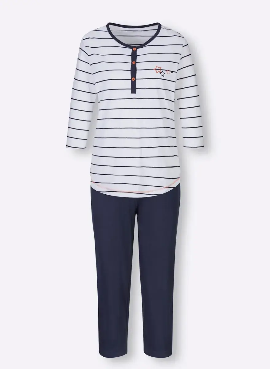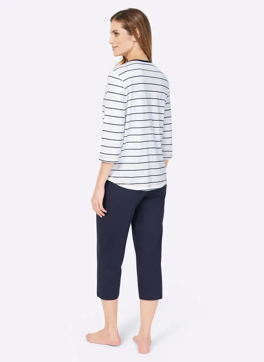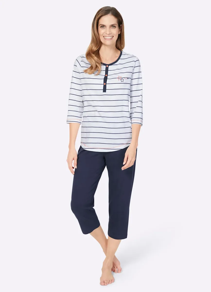 Удобная пижама брендового качества от компании Waschpur. Топ с полосатым узором, окрашенным пряжей по всей поверхности, и мотивом спереди. Круглый вырез горловины и планка с пуговицами расставляют контрастные цветовые акценты. Рукава 3/4. Закругленный низ с контрастными швами. Брюки длиной 3/4 с эластичным поясом по всему периметру и прямыми манжетами. Одинарный трикотаж из чистого хлопка. Покупая, вы поддерживаете инициативу «Хлопок, сделанный в Африке». 100% хлопок.