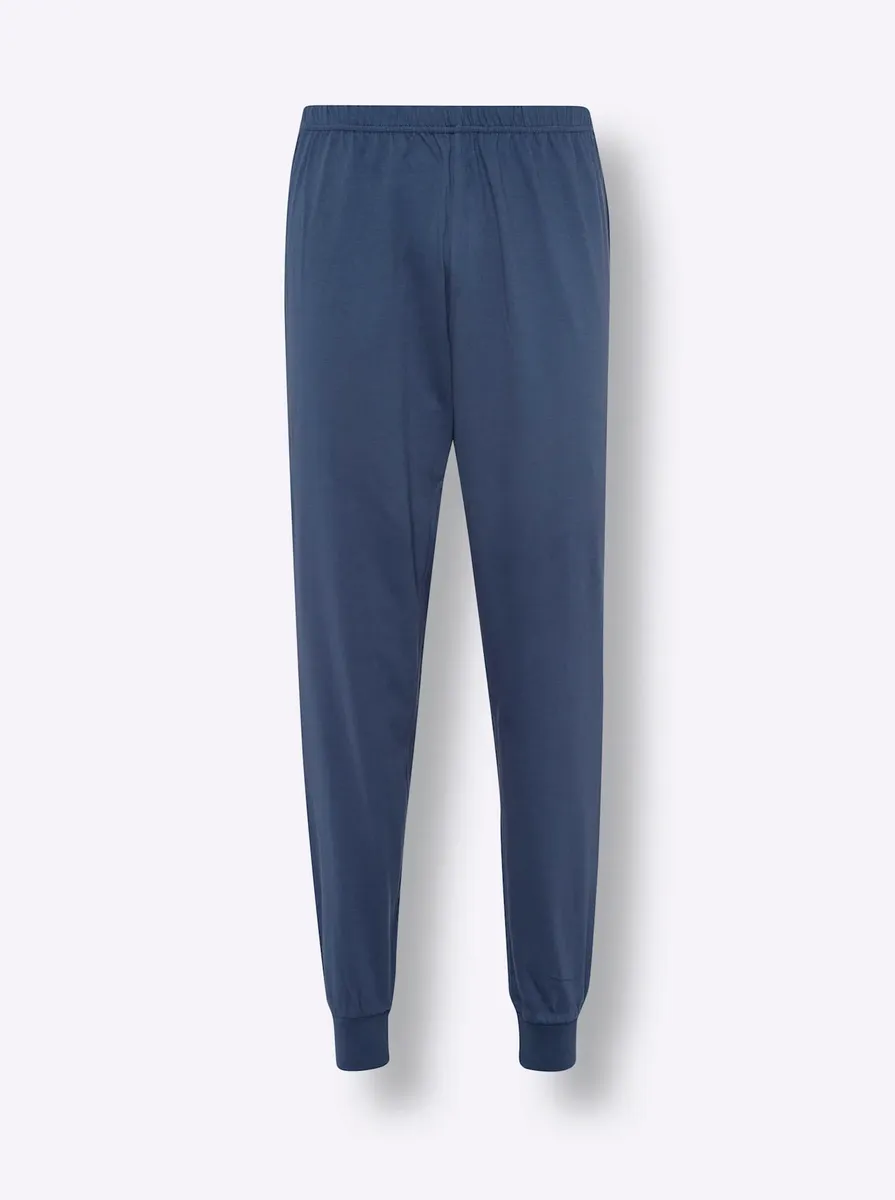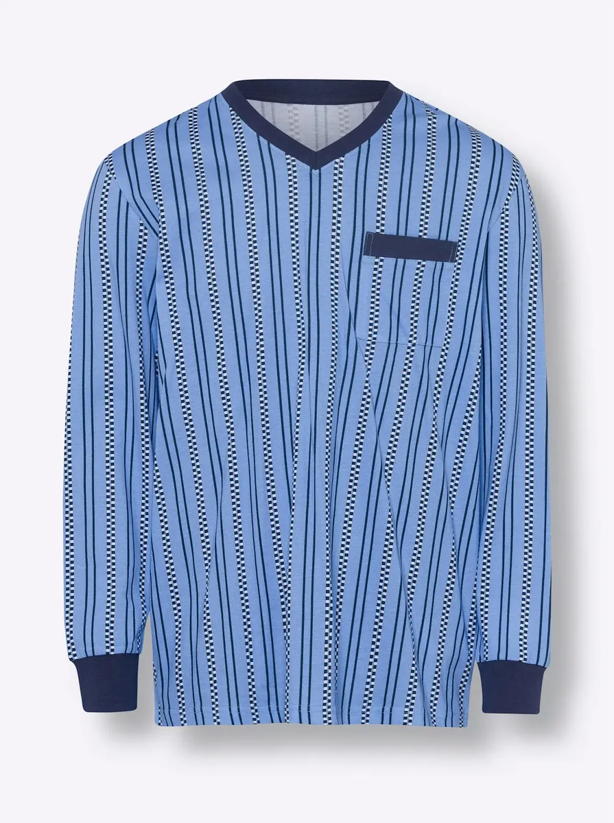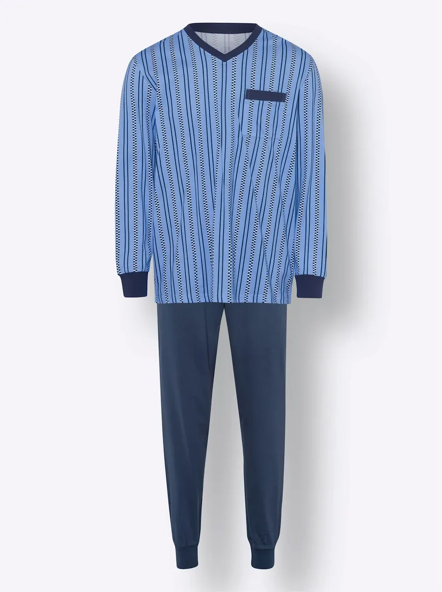 Надевайте и чувствуйте себя комфортно: пижама из чистого хлопка с широкими эластичными манжетами в рубчик на длинных рукавах и манжетах на штанинах. Топ с V-образным вырезом, нагрудным карманом и манжетами контрастного цвета с полосатым рисунком, а также длинные брюки с эластичной талией. 100% хлопок. Машинная стирка.