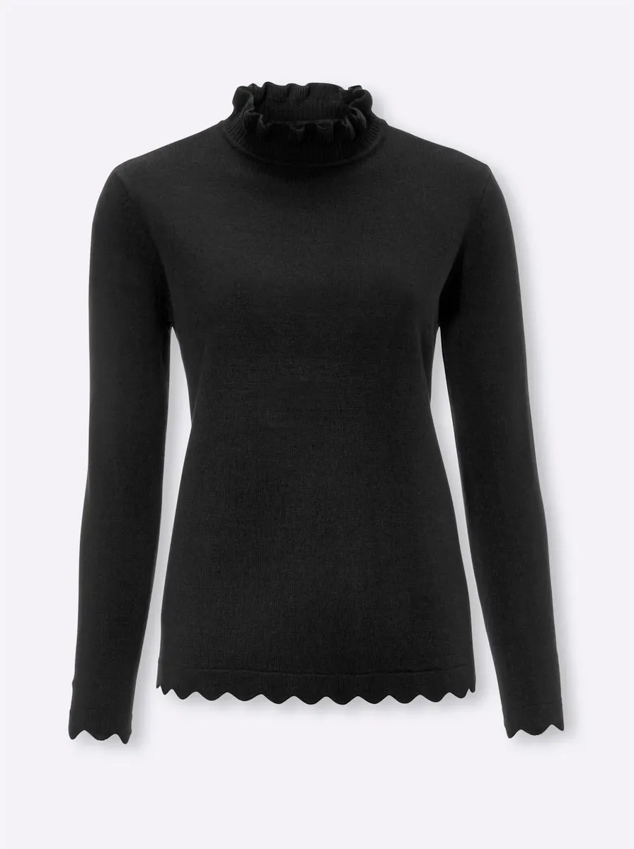 Сочетание прочности и простоты в уходе, стильности и убедительно доступной цены! Пуловер с эффектным воротником-стойкой и женственными волнистыми краями на длинных рукавах и подоле. 100% полиакрил. Машинная стирка.