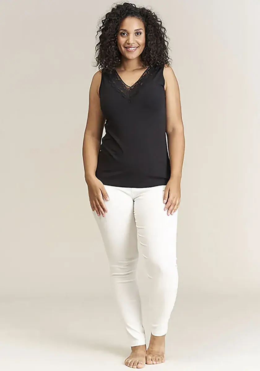 Сочетание строгой женской майки от SANDGAARD ​​с романтическим кружевом. С обычным разрезом. Можно совмещать для работы и после работы. Верх из приятной для кожи и эластичной смеси хлопка обеспечивает удобную посадку.