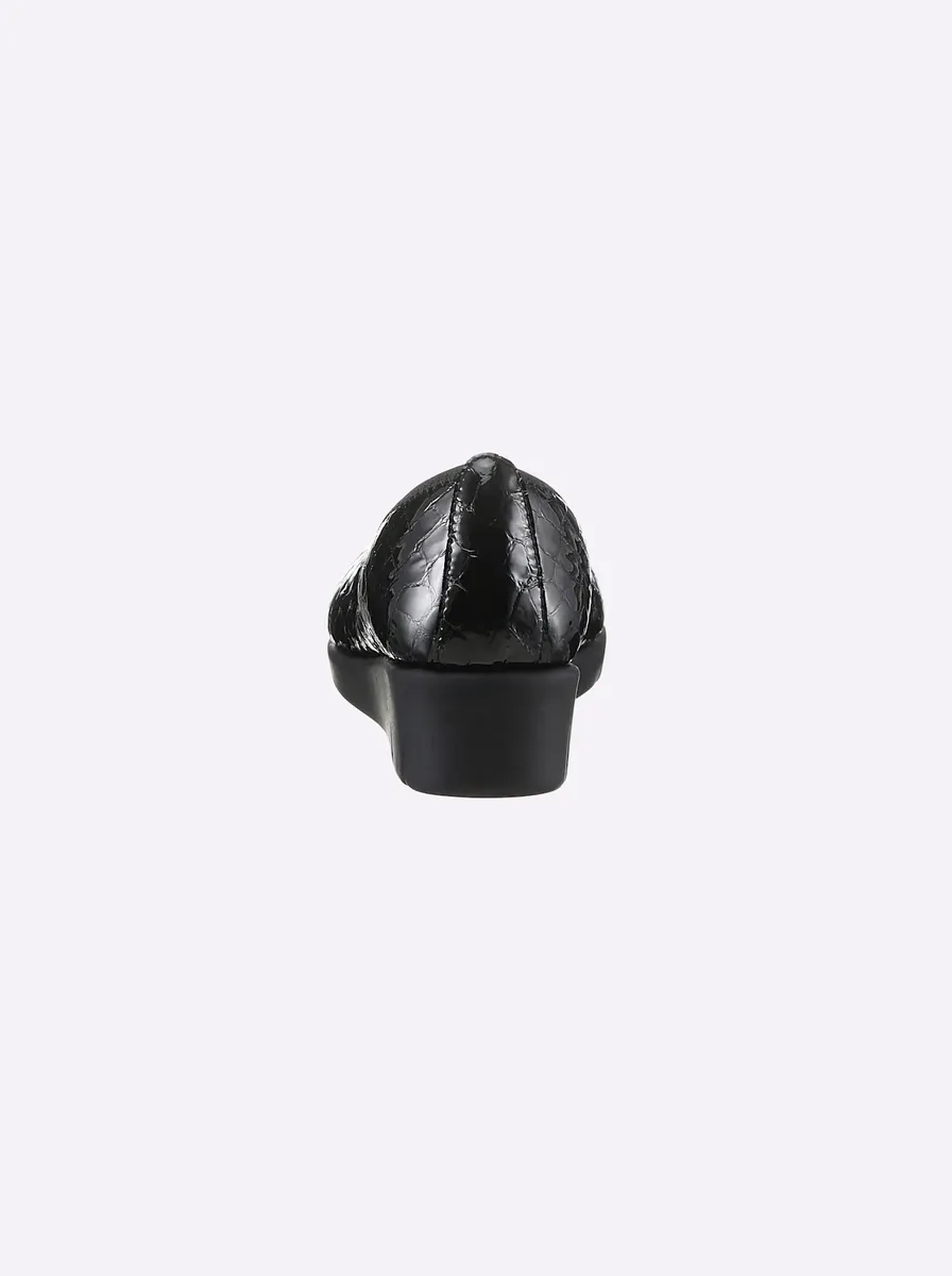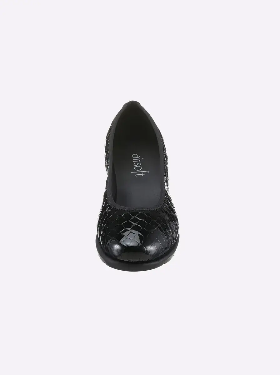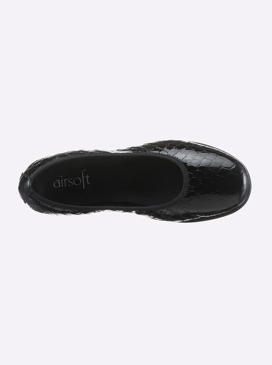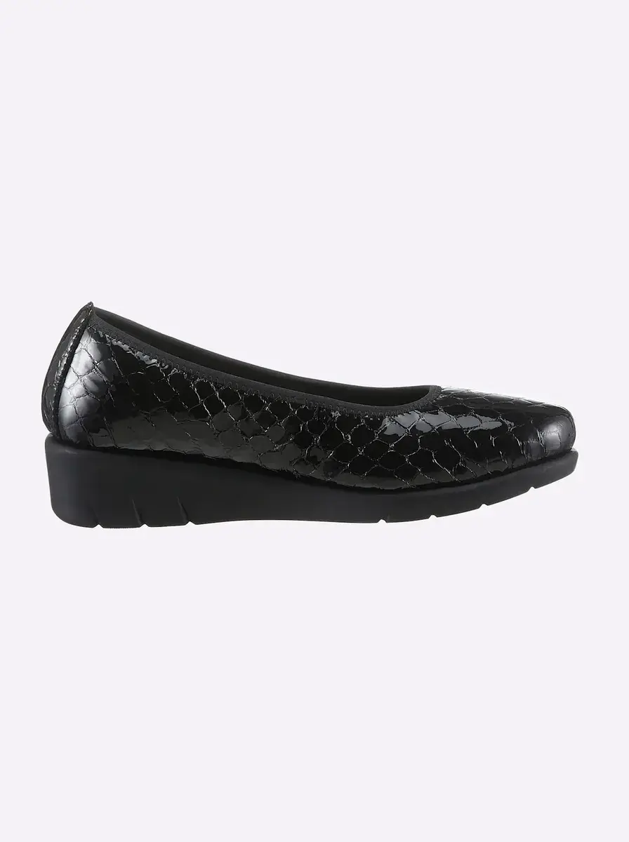 Наденьте, чувствуйте себя хорошо, хорошо выглядите: балерина airsoft Comfort+ из лакированной кожи с тиснением под крокодила отвечает всем требованиям, предъявляемым к успешной и легкой обуви. Эластичная окантовка обеспечивает идеальную посадку. Внутренняя подкладка: искусственная кожа. Кожаная стелька. Устойчивость к скольжению благодаря резиновой подошве с танкеткой высотой около 35 мм. Ширина Г.