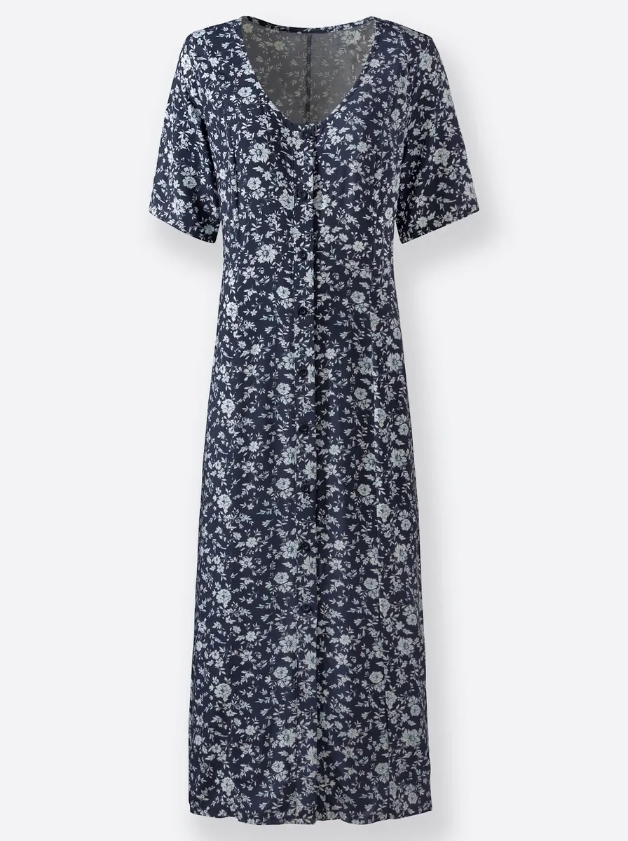 Надеть это летнее платье с цветочным принтом по всей поверхности будет одно удовольствие! Вырез слегка расклешенный и очень привлекательный. Разделительные швы спереди и сзади, а также шов на талии обеспечивают приятную посадку. С закругленным V-образным вырезом и планкой на пуговицах во всю длину. Плавное качество. 100% вискоза. Машинная стирка.