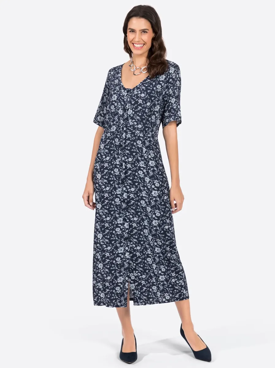 Надеть это летнее платье с цветочным принтом по всей поверхности будет одно удовольствие! Вырез слегка расклешенный и очень привлекательный. Разделительные швы спереди и сзади, а также шов на талии обеспечивают приятную посадку. С закругленным V-образным вырезом и планкой на пуговицах во всю длину. Плавное качество. 100% вискоза. Машинная стирка.