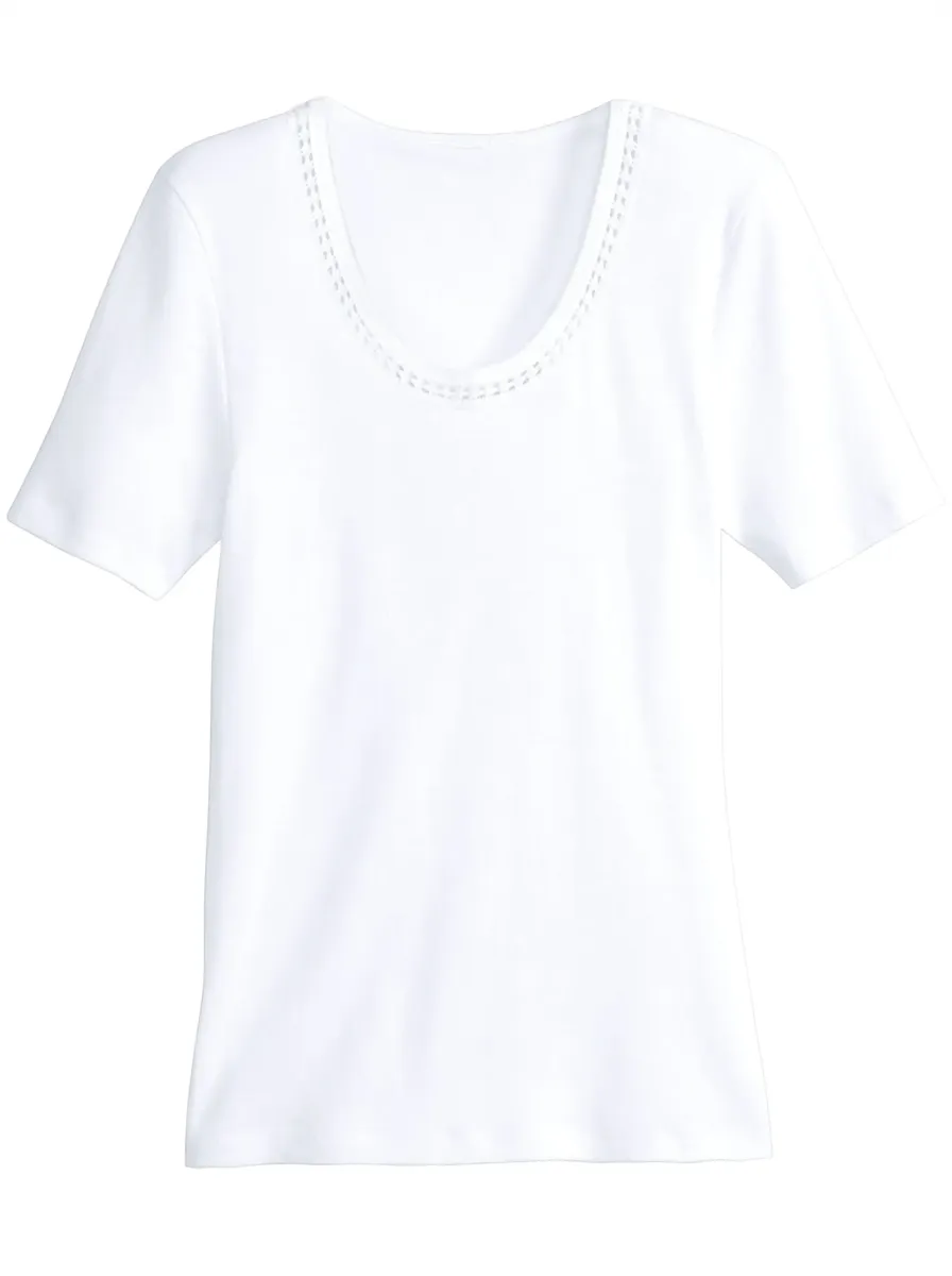 Спенсер с коротким рукавом от con-ta. С кружевной мережкой в ​​зоне декольте. Без боковых швов. Тонкие ребра, супер прочесаны. 100% хлопок.