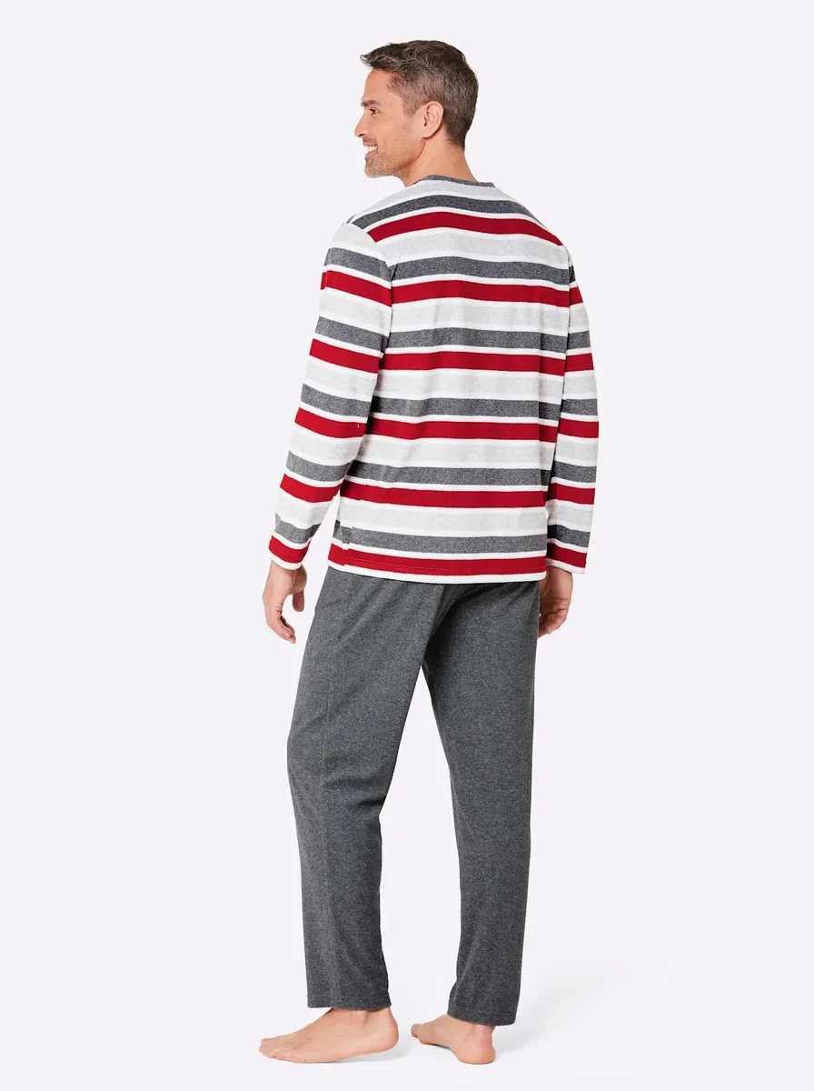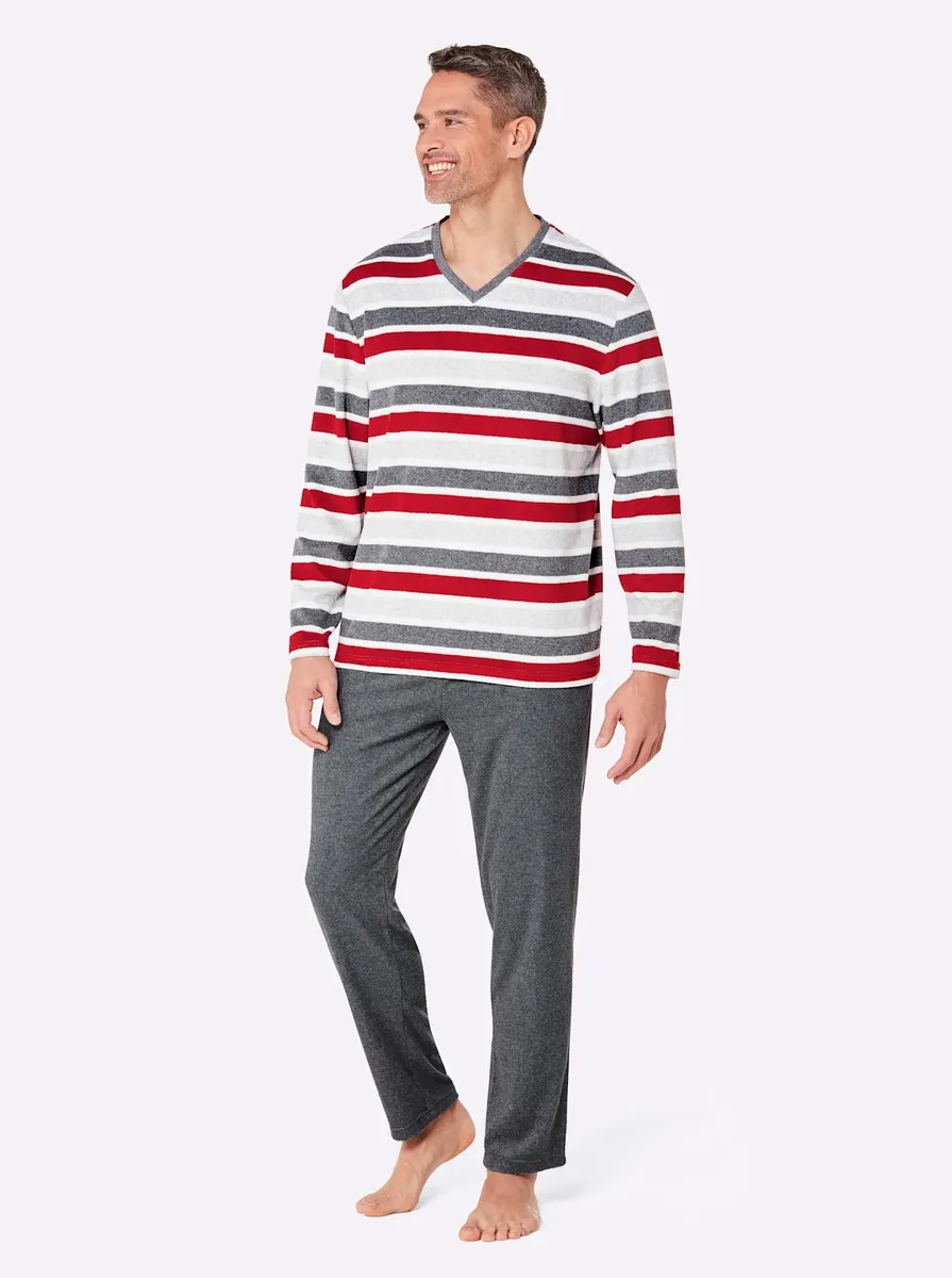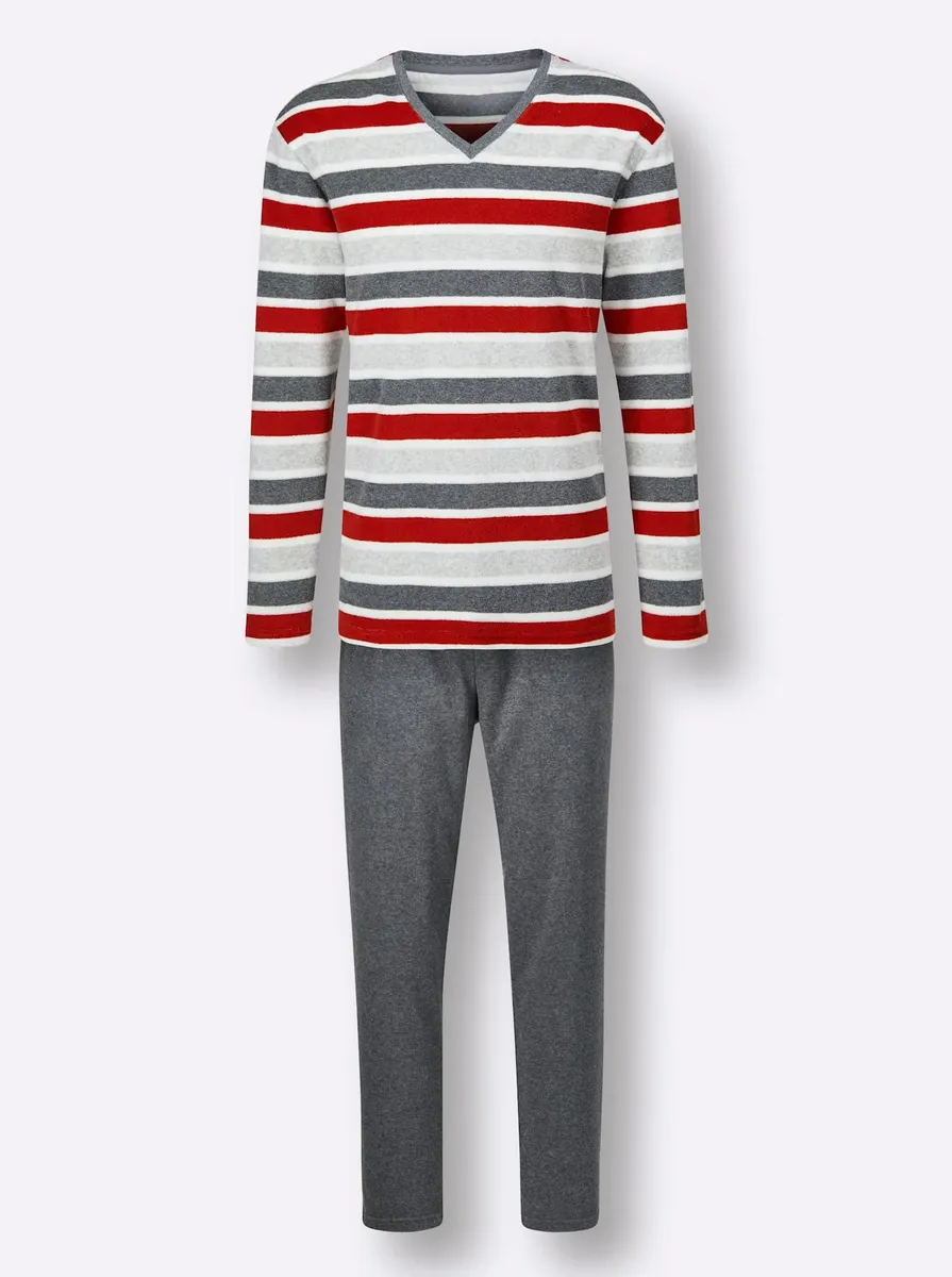 Спите спокойно в этой пижаме из приятной и мягкой тонкой махровой ткани в полоску. С V-образным вырезом. Длинные брюки с эластичным поясом с завязками и 2 карманами. Окрашена в пряжу для стойкого сохранения свежих цветов. Поддержите инициативу «Хлопок, сделанный в Африке». 80% хлопок, 20% полиэстер.