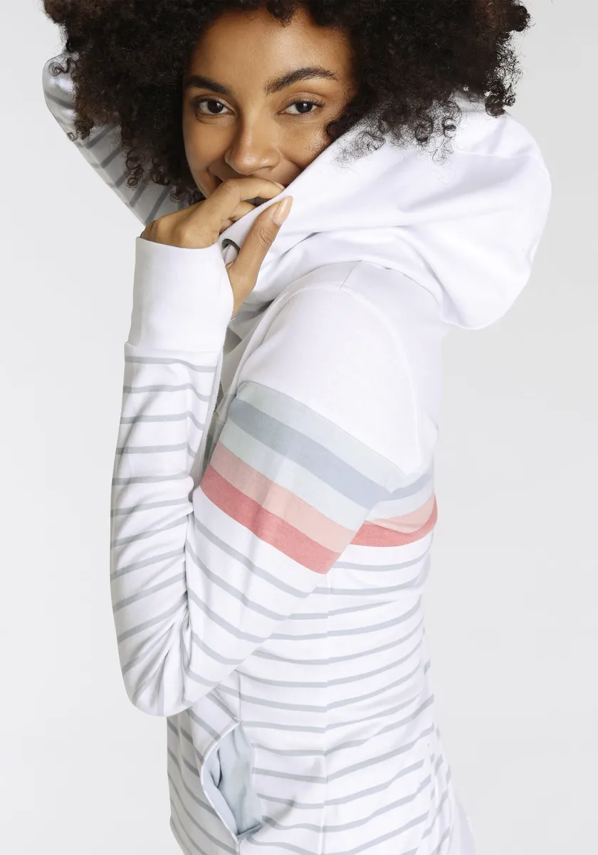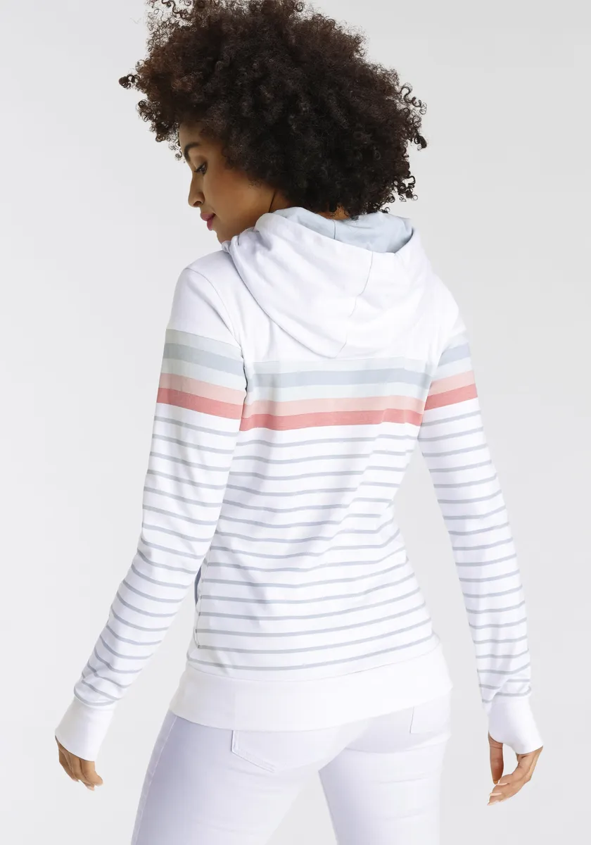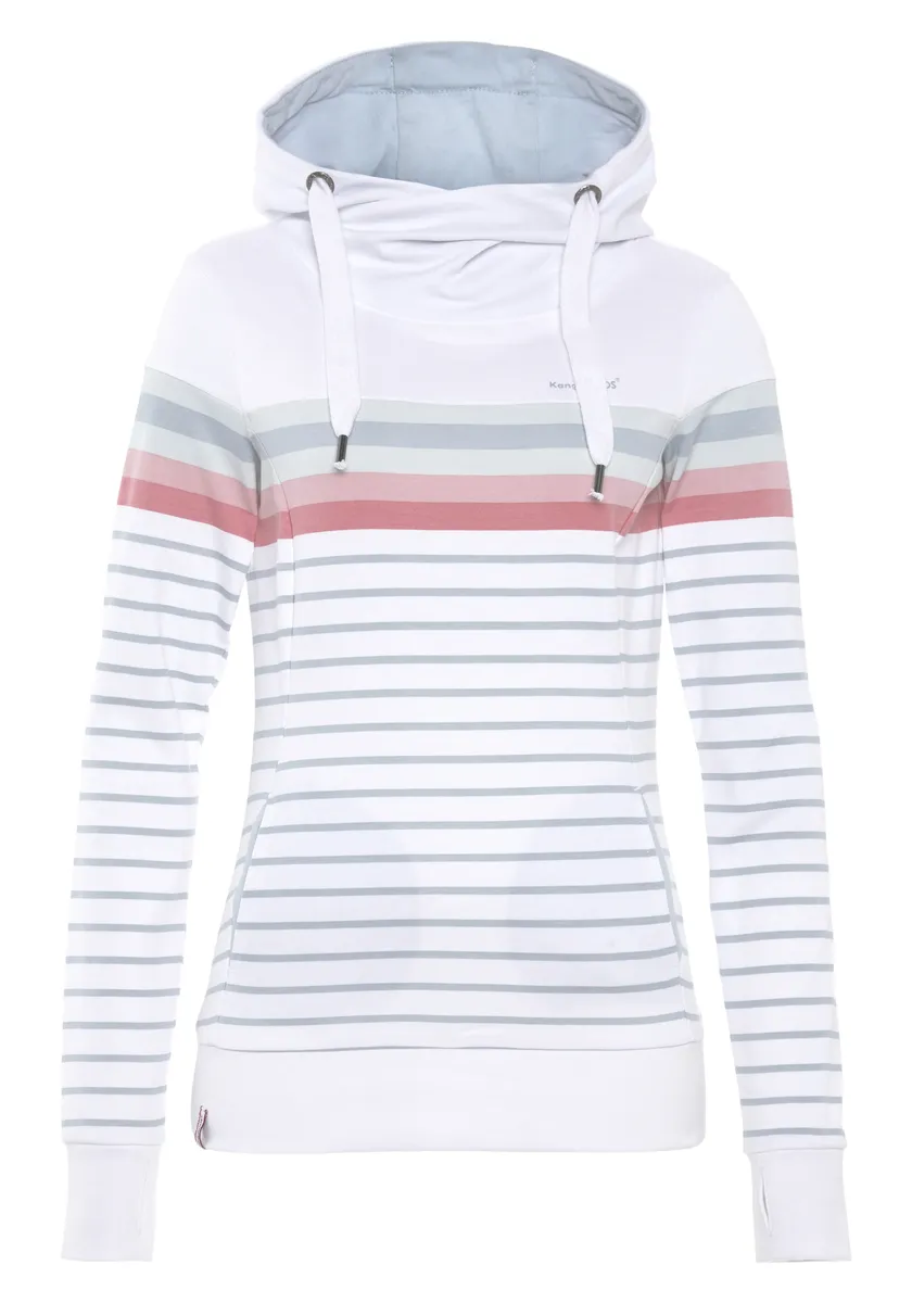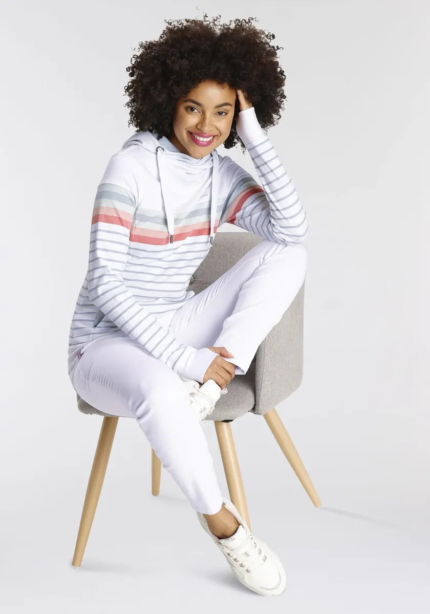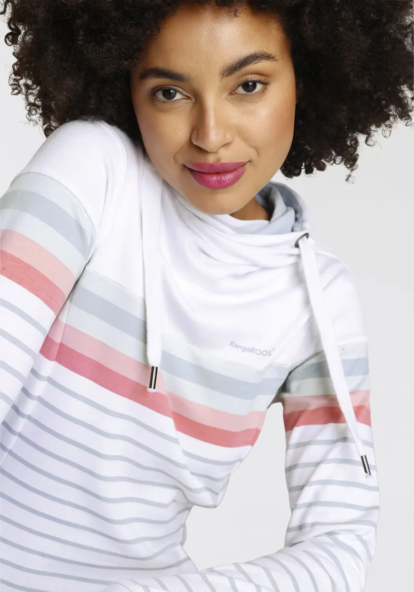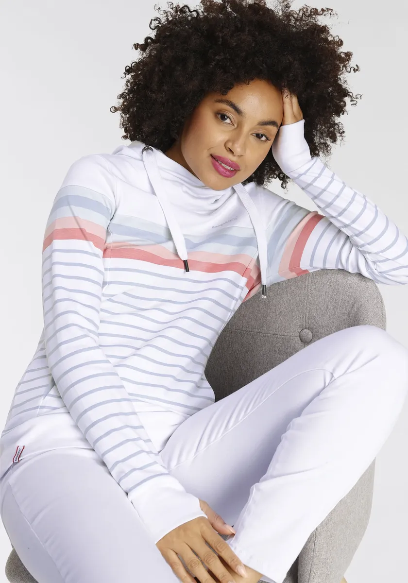 Спортивная женская толстовка от KangaROOS. С прикрывающим бедра и гибким кроем. Рукава длинные. Толстовка также имеет практичный капюшон на кулиске. Благодаря стабильным размерам и мягкому качеству интерлок верх ощущается особенно комфортно при ношении.