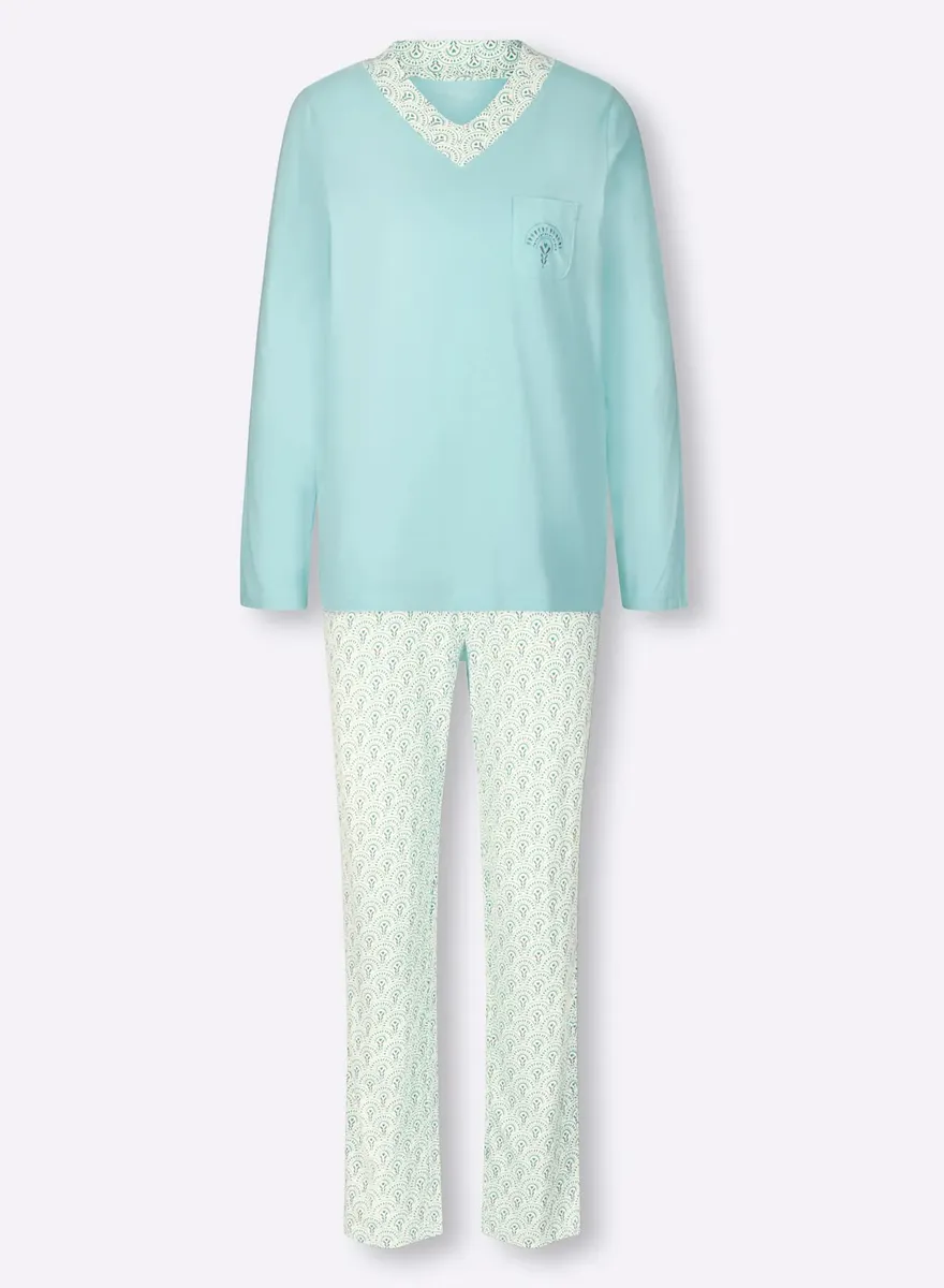 Наслаждайтесь комфортным сном в этой пижаме с красивым рисунком! Сумка с нанесенным принтом. V-образный вырез с планкой с принтом и нагрудным карманом. Длинные брюки с рисунком по всей поверхности и эластичным поясом. Одинарный трикотаж. Поддержите инициативу «Хлопок, сделанный в Африке». 100% хлопок.