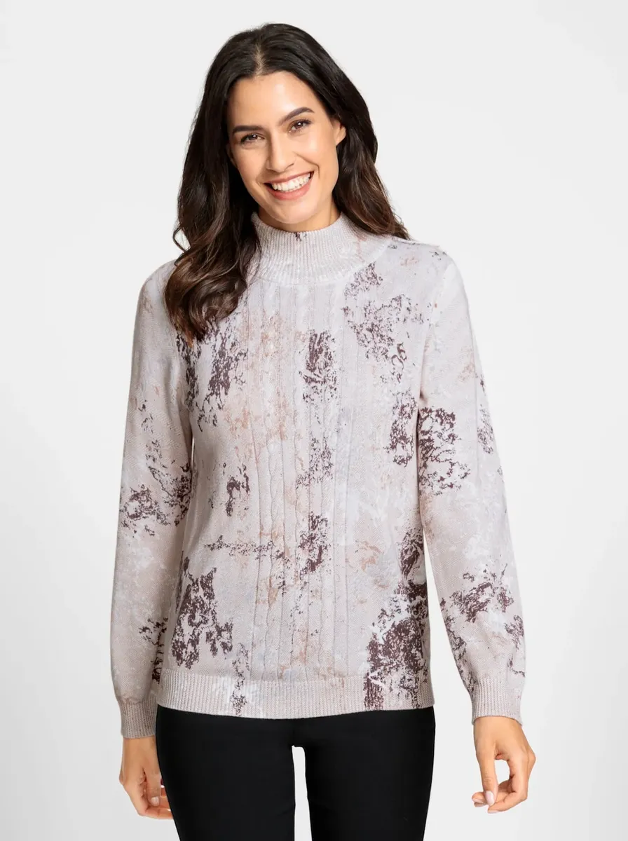 Свитер впечатляет мягким, комфортным сочетанием материалов гладкой тонкой вязки с узором кос спереди и дополнительным модным принтом в виде елочки. Связано по фигуре качественно. Высокий воротник-стойка из трикотажа в рубчик очень привлекательный. Ребристые манжеты на длинных рукавах и по нижнему краю эластичные. 60% вискоза, 40% хлопок. Машинная стирка.