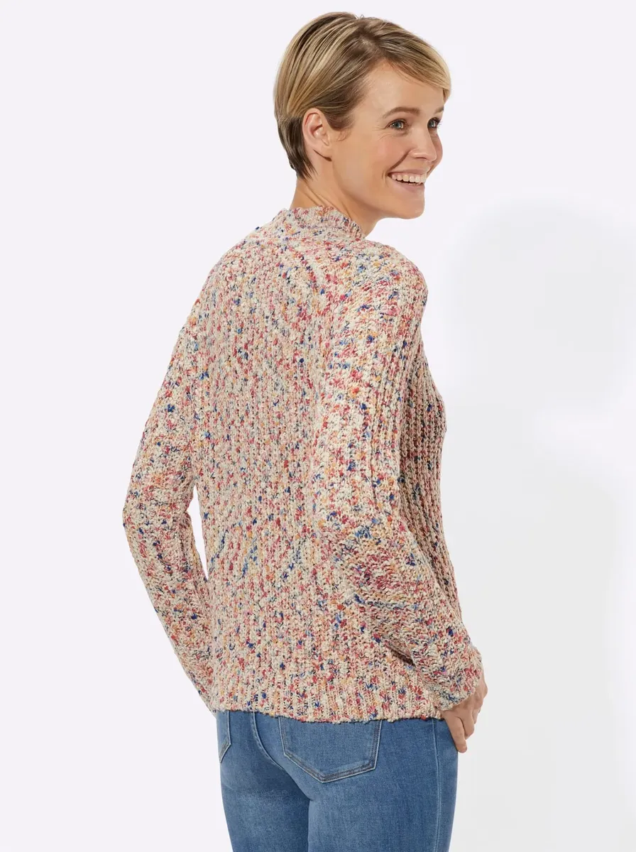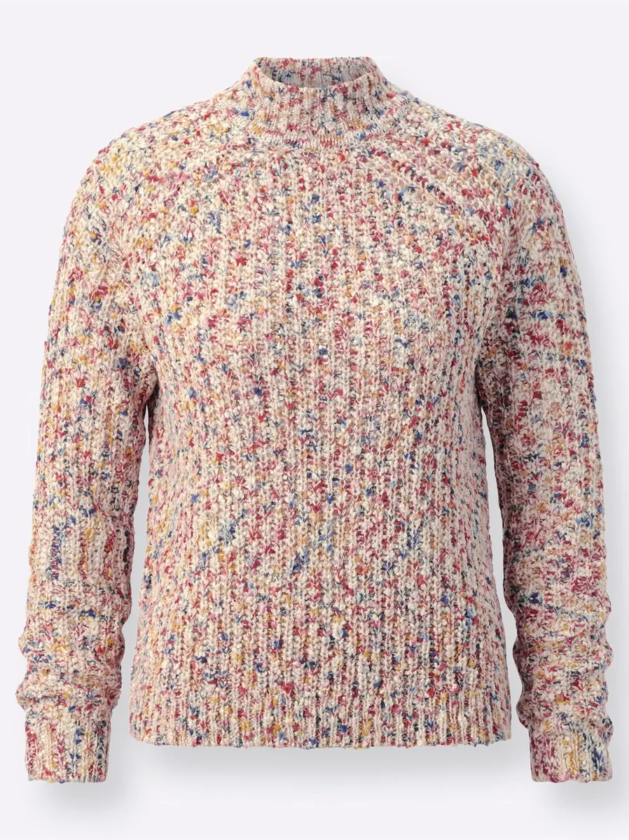 Свитер выполнен из высококачественной лакированной вязки букле из яркой разноцветной пряжи. С теплым воротником-стойкой и длинными рукавами реглан. Эластичные резиновые нити встроены во все ребристые концы. 100% полиакрил. Машинная стирка.