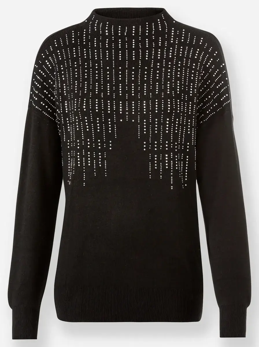 Свитер выполнен из красивой смесовой вискозы. Лицевая сторона украшена эффектными аппликациями из блестящих камней. Модный воротник-стойка, заниженная линия плеча и длинные рукава. С ребристыми концами. 80% вискоза, 20% полиамид. Машинная стирка.
