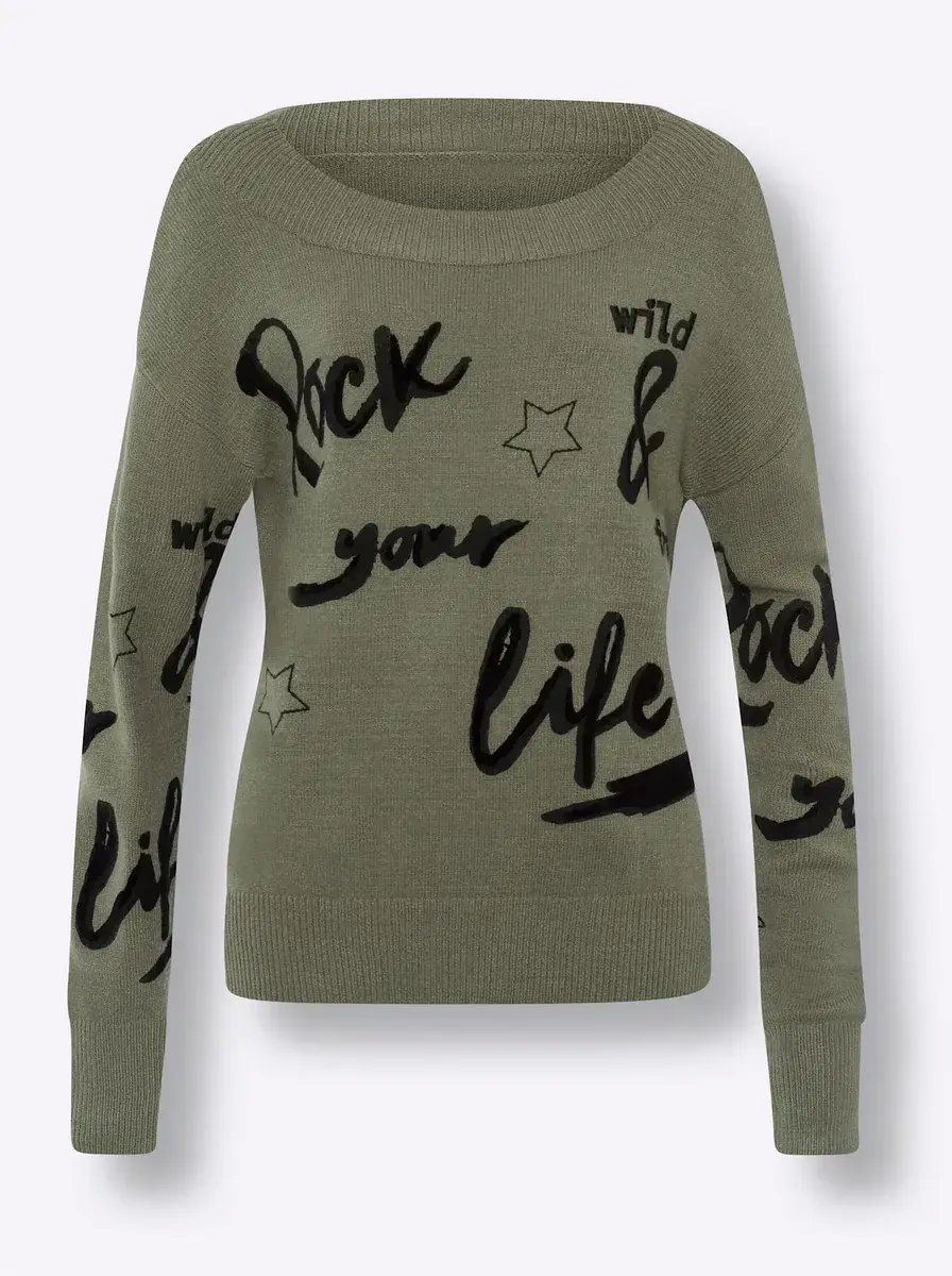 Свитер Выразительные надписи и звезды в флоке спереди модно привлекают внимание. Широкий ребристый круглый вырез и заниженная линия плеч. Ребристые манжеты на длинных рукавах и по нижнему краю. 50% вискоза, 28% полиэстер, 22% полиамид. Машинная стирка.