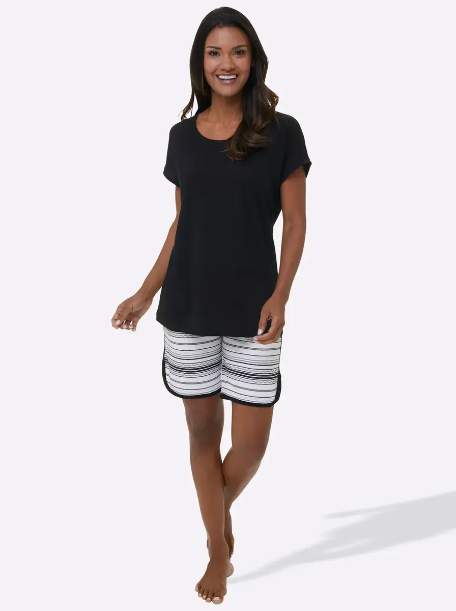 Эти летние шорты такие красивые, они продаются в двойной упаковке! Одна часть полосатая, другая однотонная. Рубашки с круглым вырезом и заниженной линией плеч. Короткие брюки с завязками и разрезами по бокам. Изготовлен из невероятно мягкого трикотажа. 50% хлопок, 50% модал.