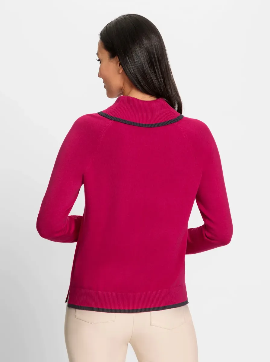 Свитер с высоким воротником из мягкой тонкой вязки со спортивными контрастными полосками. Прямой крой с разрезами по бокам. Длинный рукав. Ребристые манжеты. 70% вискоза (ECOVERO), 30% полиамид. Машинная стирка.