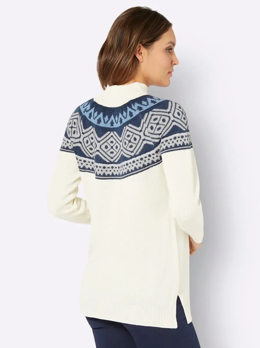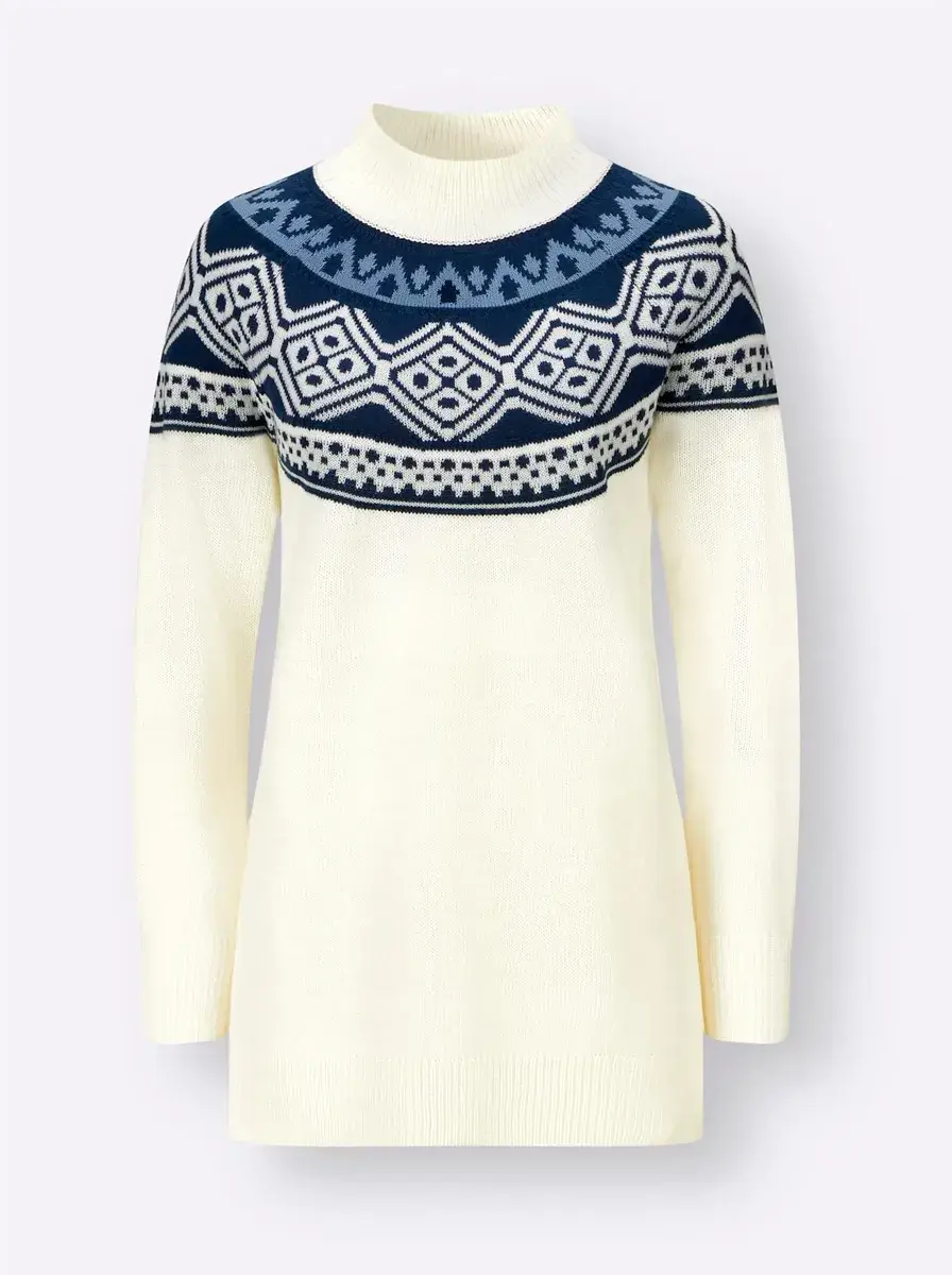 Удобный для фигуры длинный свитер спортивного норвежского жаккардового узора. С воротником стойкой и ребристыми манжетами на длинных рукавах и по нижнему краю. Боковые разрезы обеспечивают оптимальную свободу движений. 100% полиакрил. Машинная стирка.
