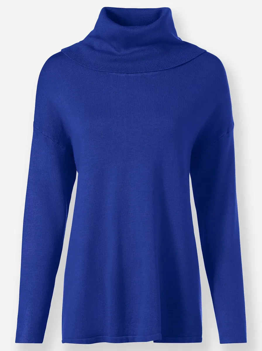 Свитер тонкой вязки в модном образе оверсайз. С эффектной водолазкой и современными заниженными плечами. Повседневный заостренный подол. Ребристый воротник и рукава. С длинными рукавами. 80% вискоза, 20% полиамид. Машинная стирка.