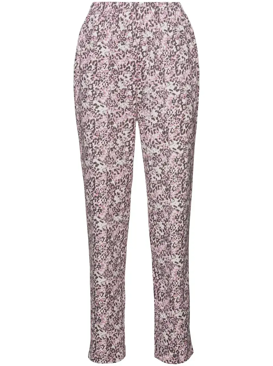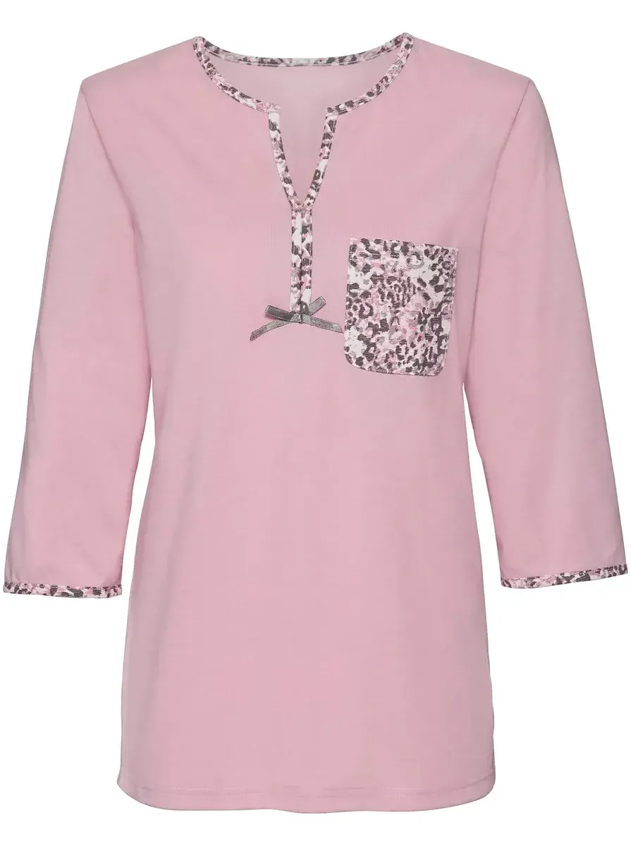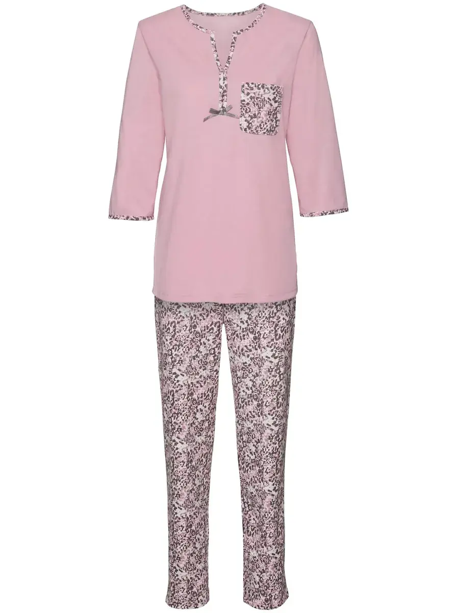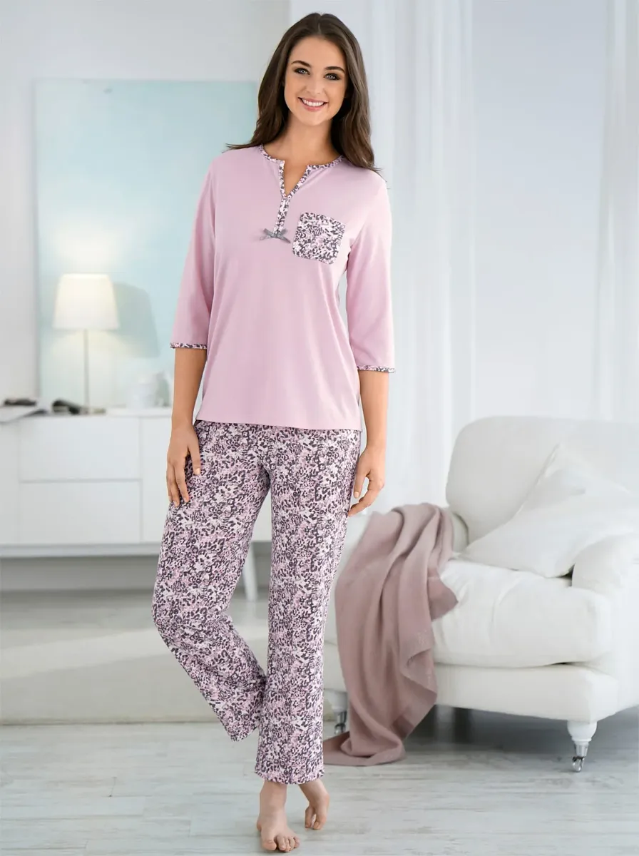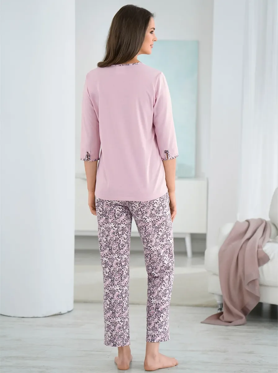 Привлекает внимание в этой пижаме декоративная окантовка на круглом вырезе с разрезом и на конце рукавов 3/4 с разрезом, а также нагрудный карман с принтом. Удобные брюки с эластичной талией и принтом. 100% хлопок.