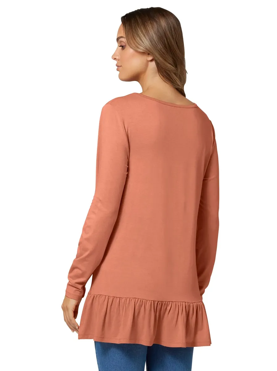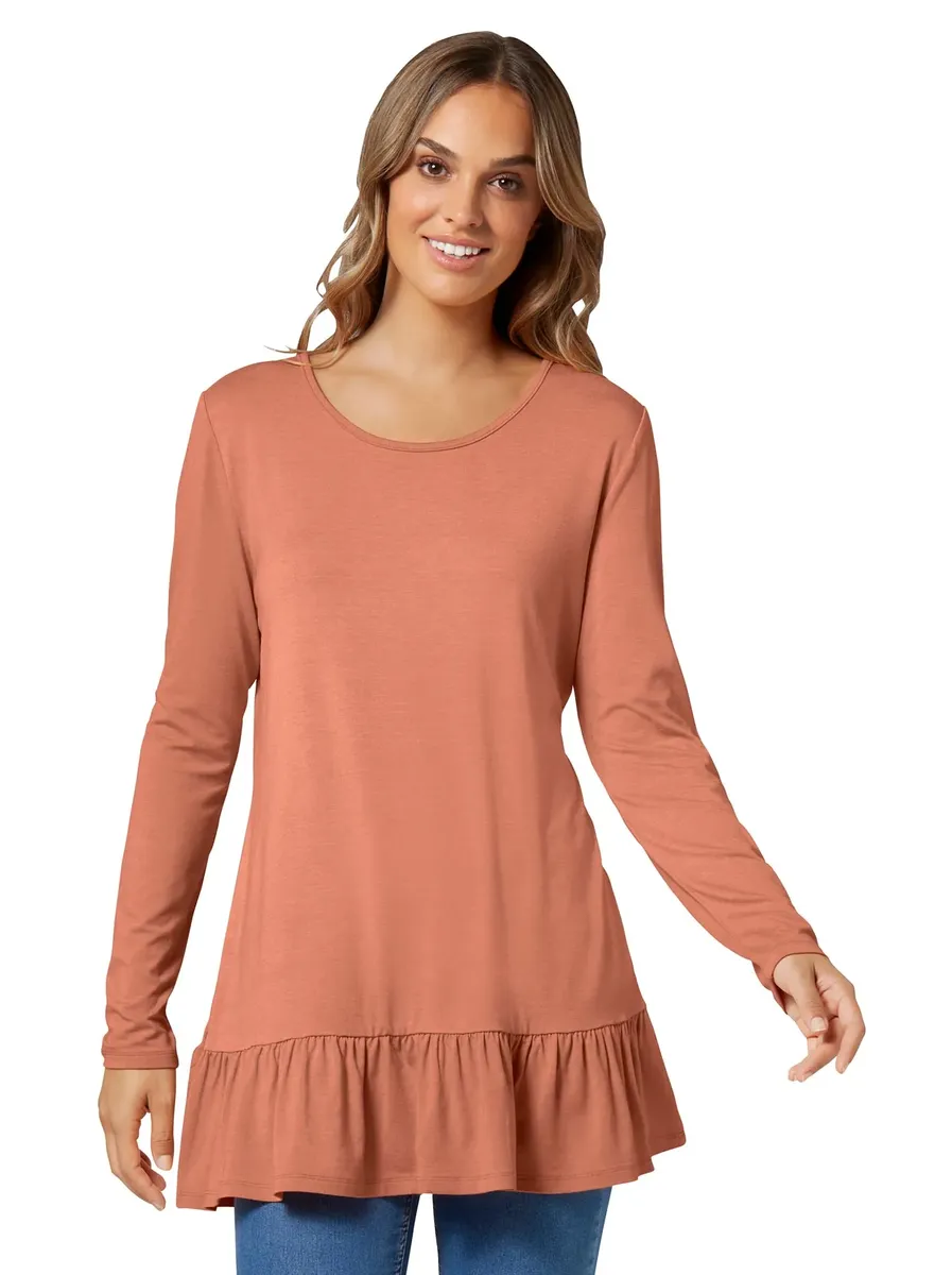 Привлекательная длинная рубашка с круглым вырезом и длинными рукавами. Прикрепленная игривая оборка по краю спереди и сзади. 95% вискоза, 5% эластан. Машинная стирка.