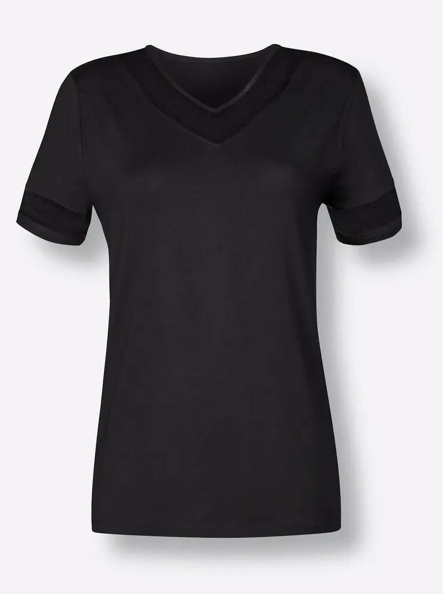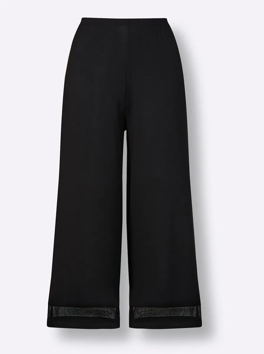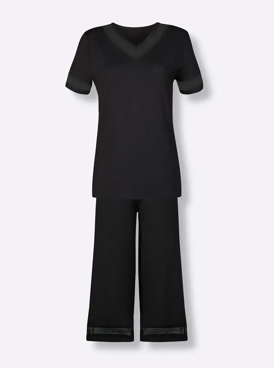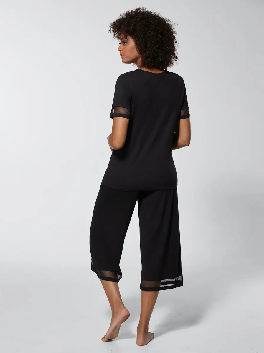 Привлекательная пижама со слегка прозрачными сетчатыми вставками на V-образном вырезе и манжетах на штанинах. Модные брюки размера 7/8 оснащены удобным поясом на резинке. Модель из мягкого одинарного трикотажа. 95% вискоза, 5% эластан.