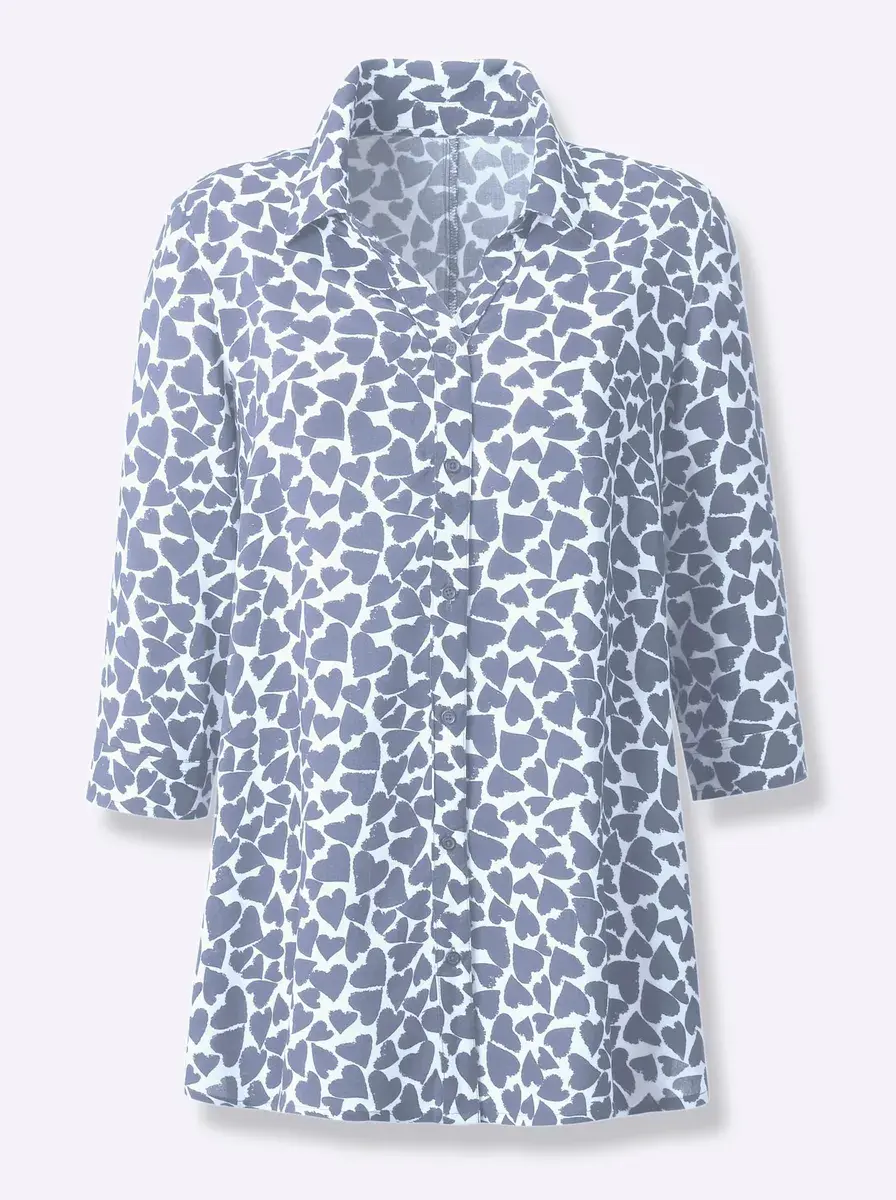 Сердце – ключевой элемент этой блузки с привлекательным принтом по всей поверхности. Воротник рубашки с открытым V-образным вырезом и планкой во всю длину с пуговицами соответствующего цвета. Облегает фигуру, легкий А-образный крой со слегка закругленным низом. Рукава 3/4 с манжетами на пуговицах. 100% вискоза. Машинная стирка.