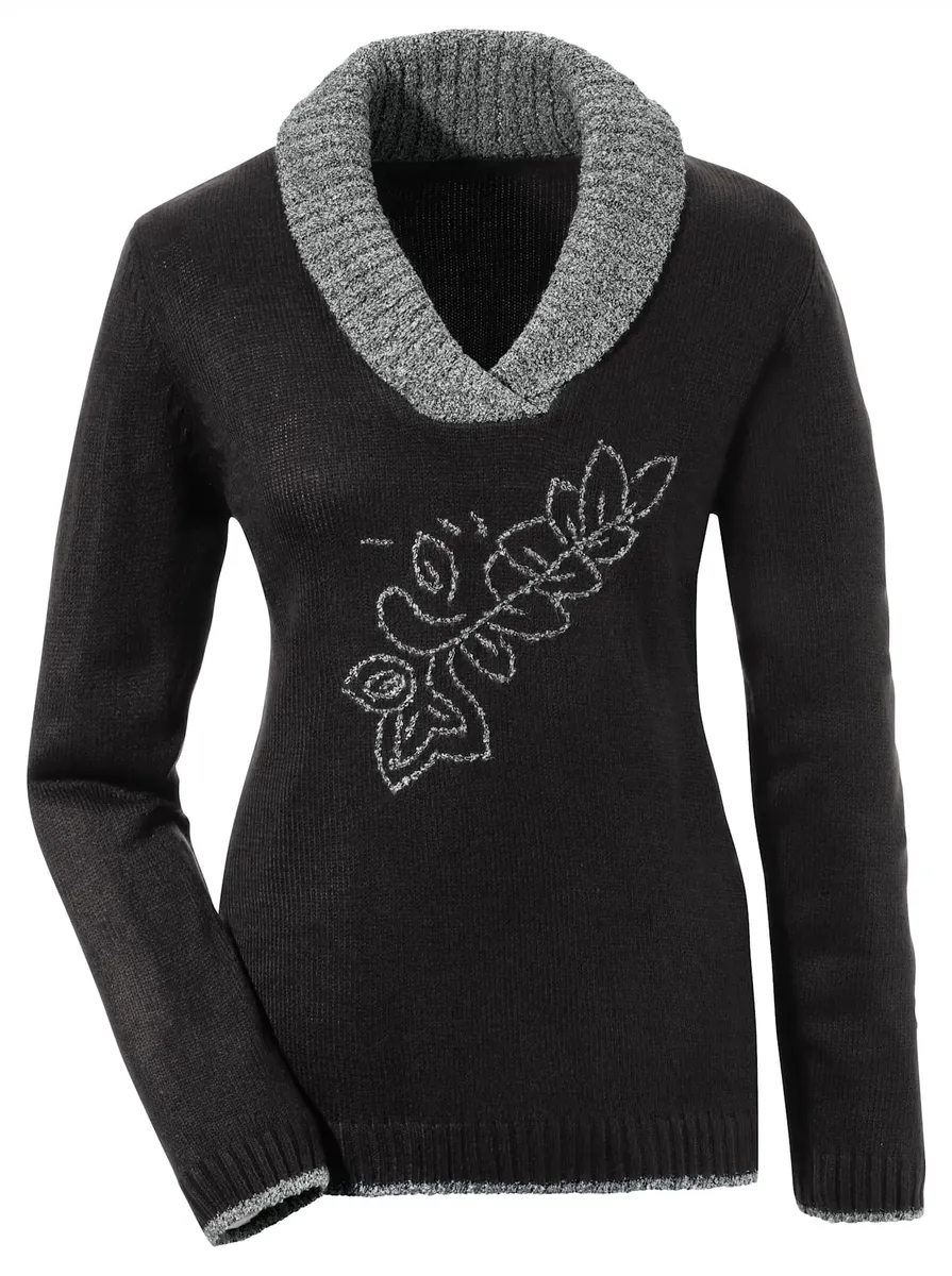 Серебристая блестящая пряжа на цветочной вышивке спереди, а также на воротнике и манжетах, которые также украшены элементами букле, придает свитеру особенный вид. 93% полиакрил, 5% полиэстер, 2% металлизированная пряжа. Машинная стирка.