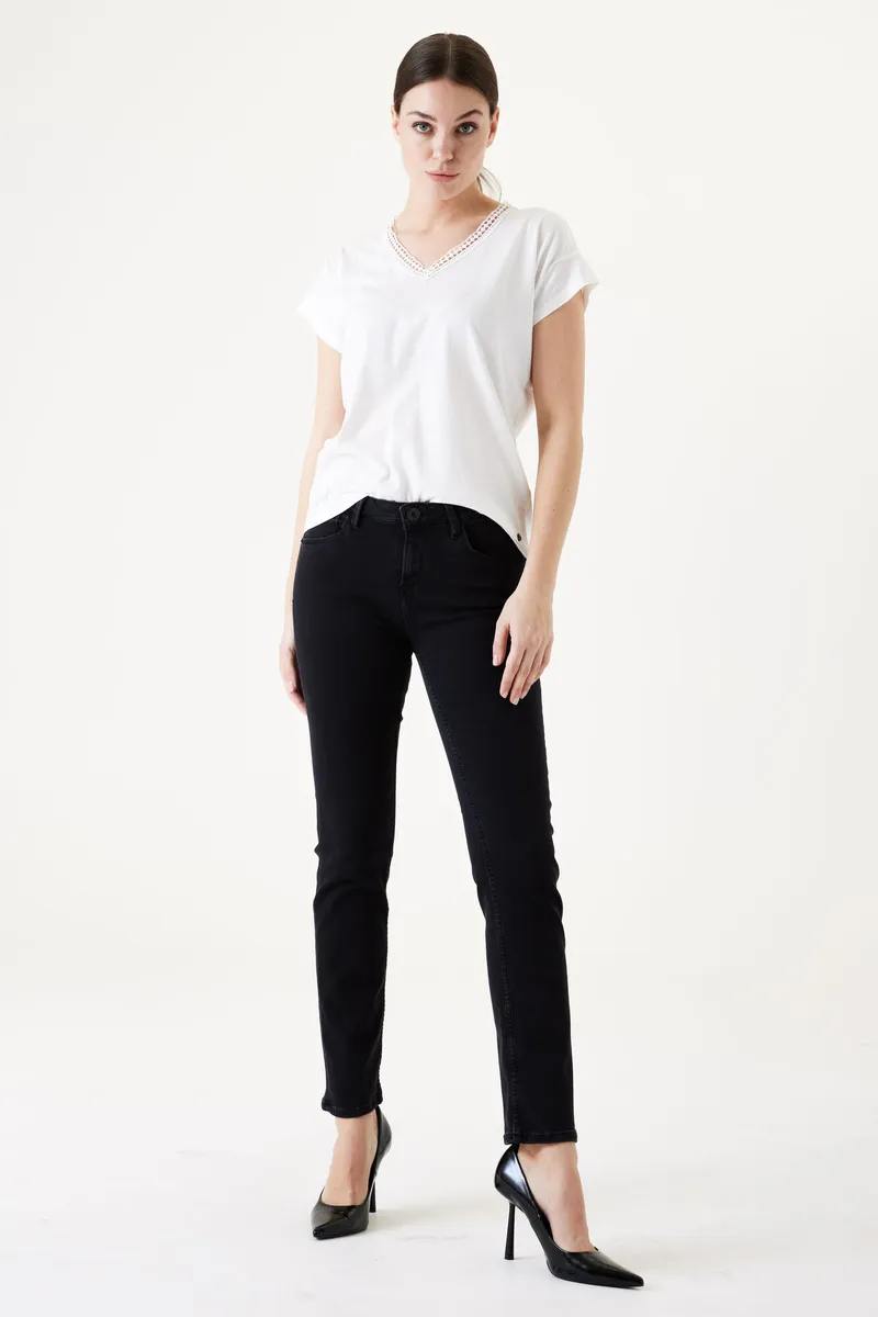 Универсальные женские джинсы-скинни от бренда Garcia. Оснащен фирменной этикеткой. Универсальные варианты комбинаций: от повседневных до оптимистичных. За брюками очень легко ухаживать благодаря прочному и прочному джинсовому материалу.