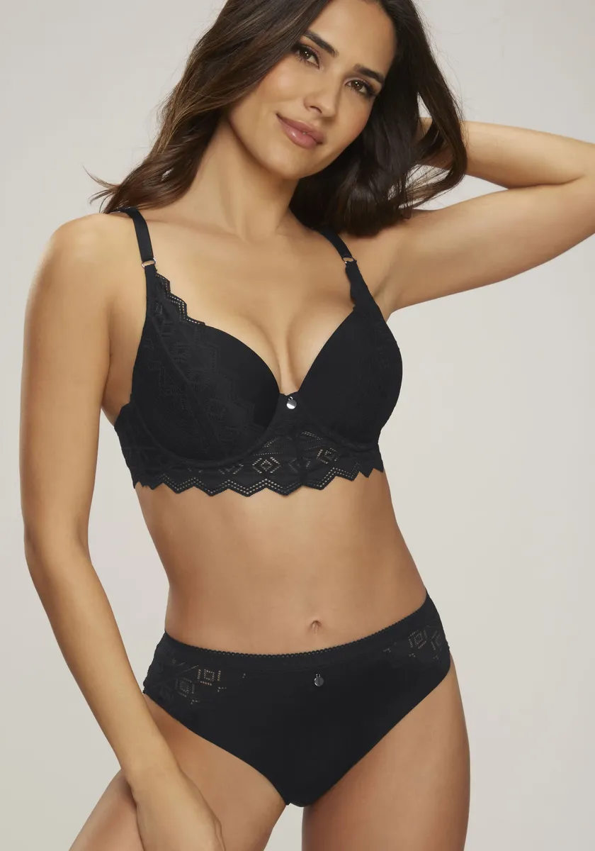 Женственные трусики с красивым кружевным поясом. Изготовлен из мягкого материала microtouch и прозрачного кружева с графическим рисунком. С прекрасным аксессуаром в центре спереди. Со встроенной хлопковой ластовицей. В наличии бюстгальтер из этой же серии. Внешний материал: 86% полиамид, 14% эластан.