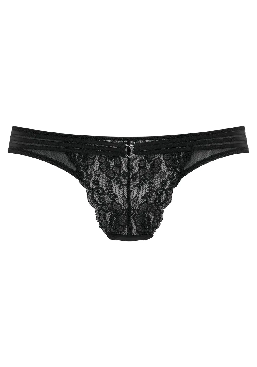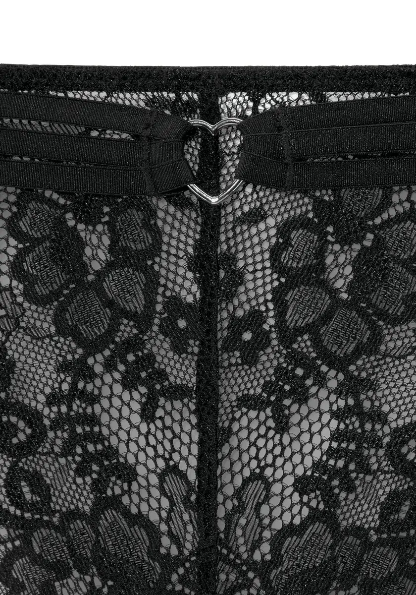 Женственные трусики-стринги из нежного кружева с декоративным сердечком. Бока и спинка из слегка прозрачной сетки. С декоративными лентами по центру спереди. Со встроенной хлопковой ластовицей для удобной посадки. Изготовлен из 88% полиамида, 12% эластана.