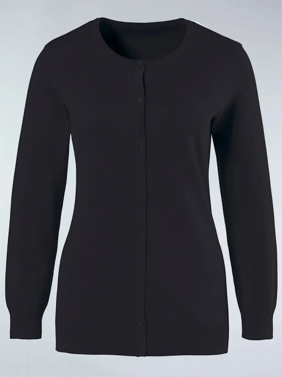 Универсальный кардиган с круглым вырезом, цветными пуговицами и ребристыми манжетами. 100% хлопок. Машинная стирка.