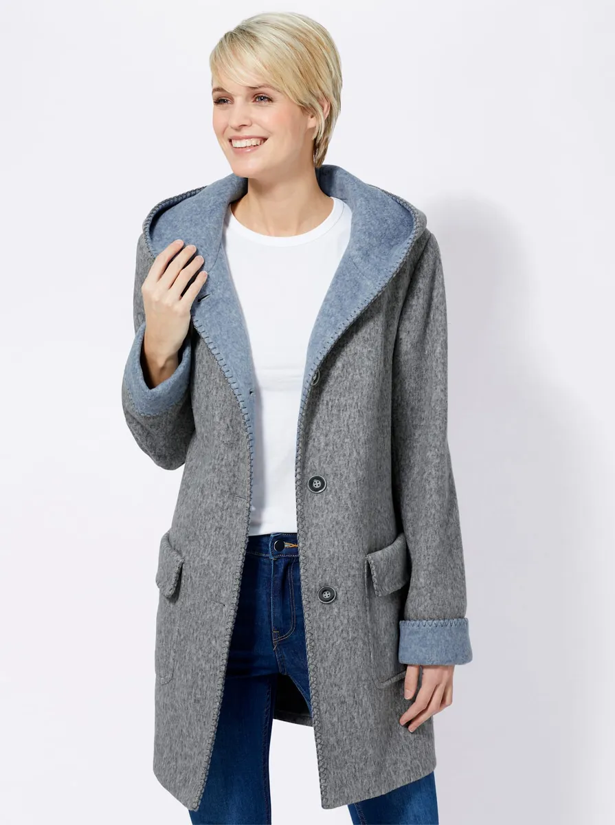 ... и зима может прийти! Приятно теплая куртка из шерсти. С декоративной строчкой по краям. Капюшон контрастного цвета, планка с пуговицами и фиксированные манжеты контрастного цвета создают приятный контраст. Непрерывная планка на пуговицах, 2 кармана с клапанами. Разделительные швы, моделирующие фигуру, спереди, средний шов сзади. 100% полиэстер. Подкладка: 100% полиэстер. Машинная стирка.
