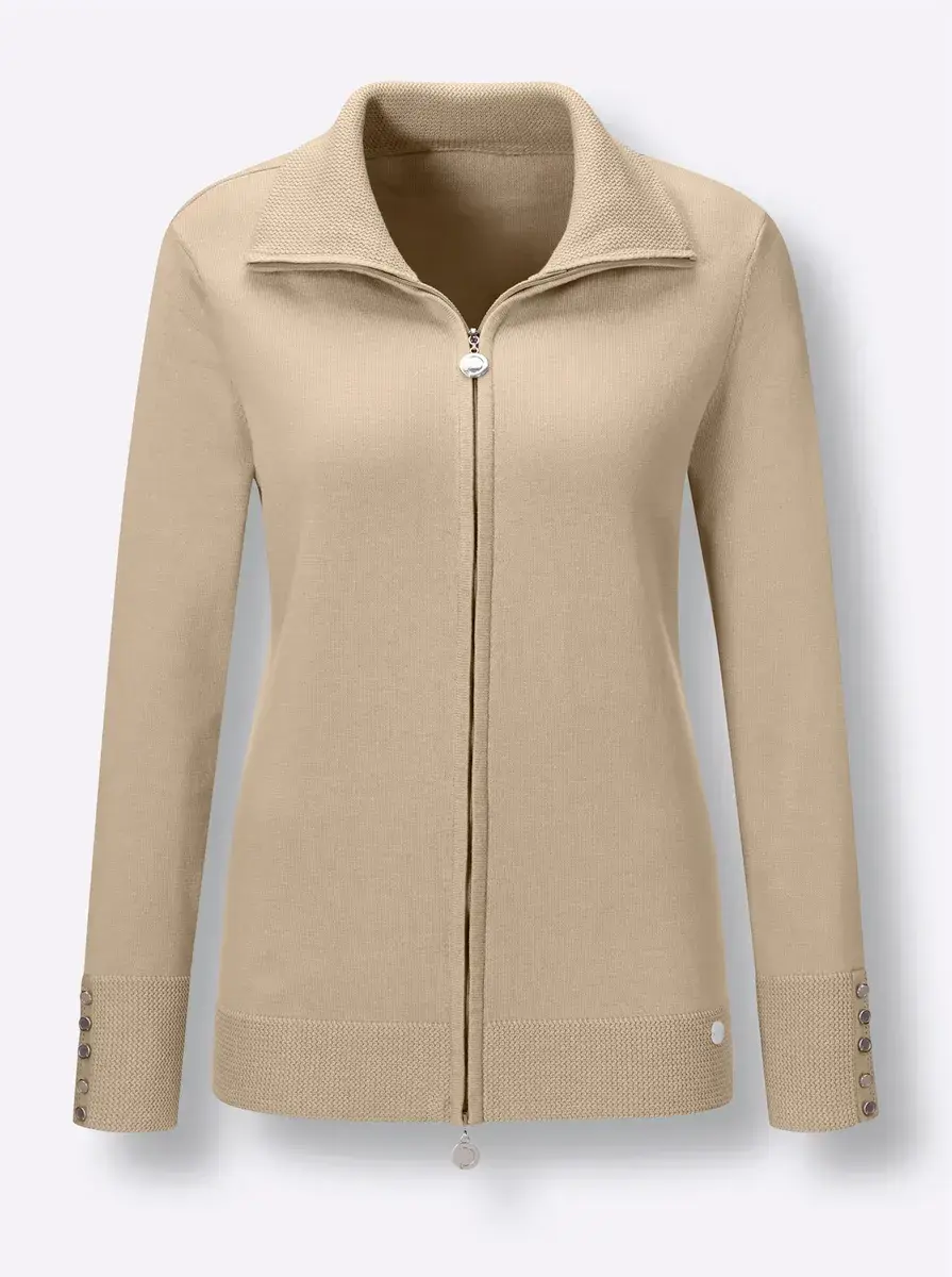Высококачественное, изысканное, мерсеризованное натуральное волокно с тонким блеском: хлопковый кардиган мягкой, тонкой вязки с волнистой структурой на концах. На манжетах декоративные пуговицы с тиснением логотипа. Потайная двусторонняя молния. Аккуратно связала по форме. Покупая, вы поддерживаете инициативу «Хлопок, сделанный в Африке». 100% хлопок. Машинная стирка.