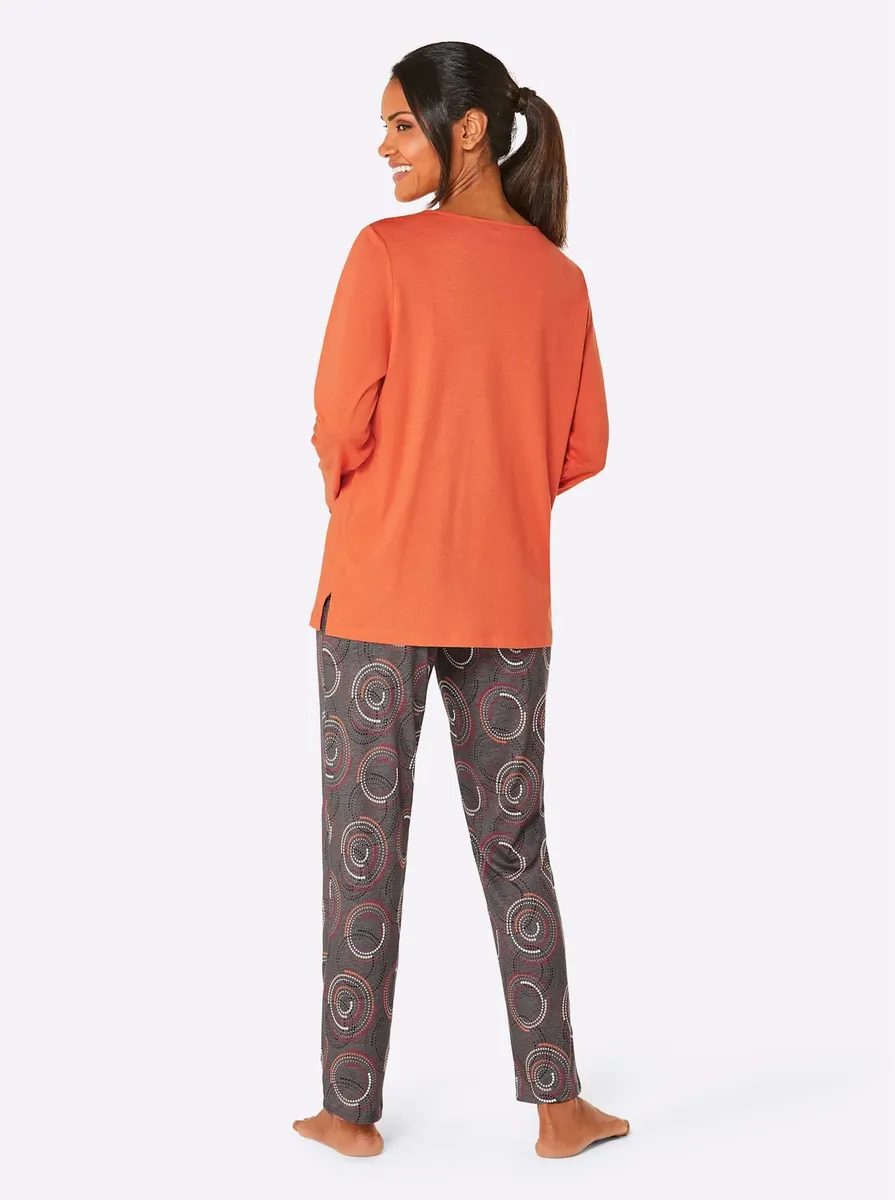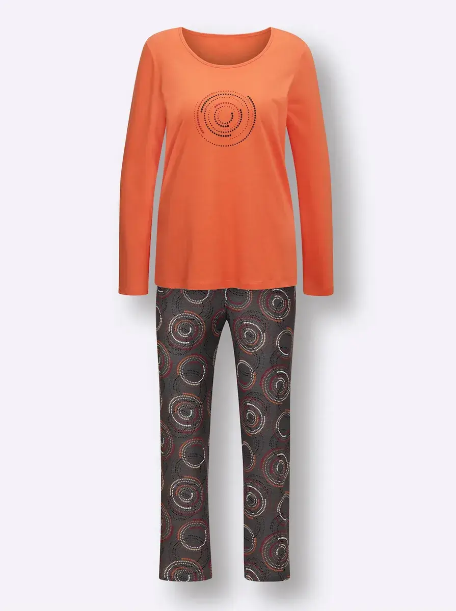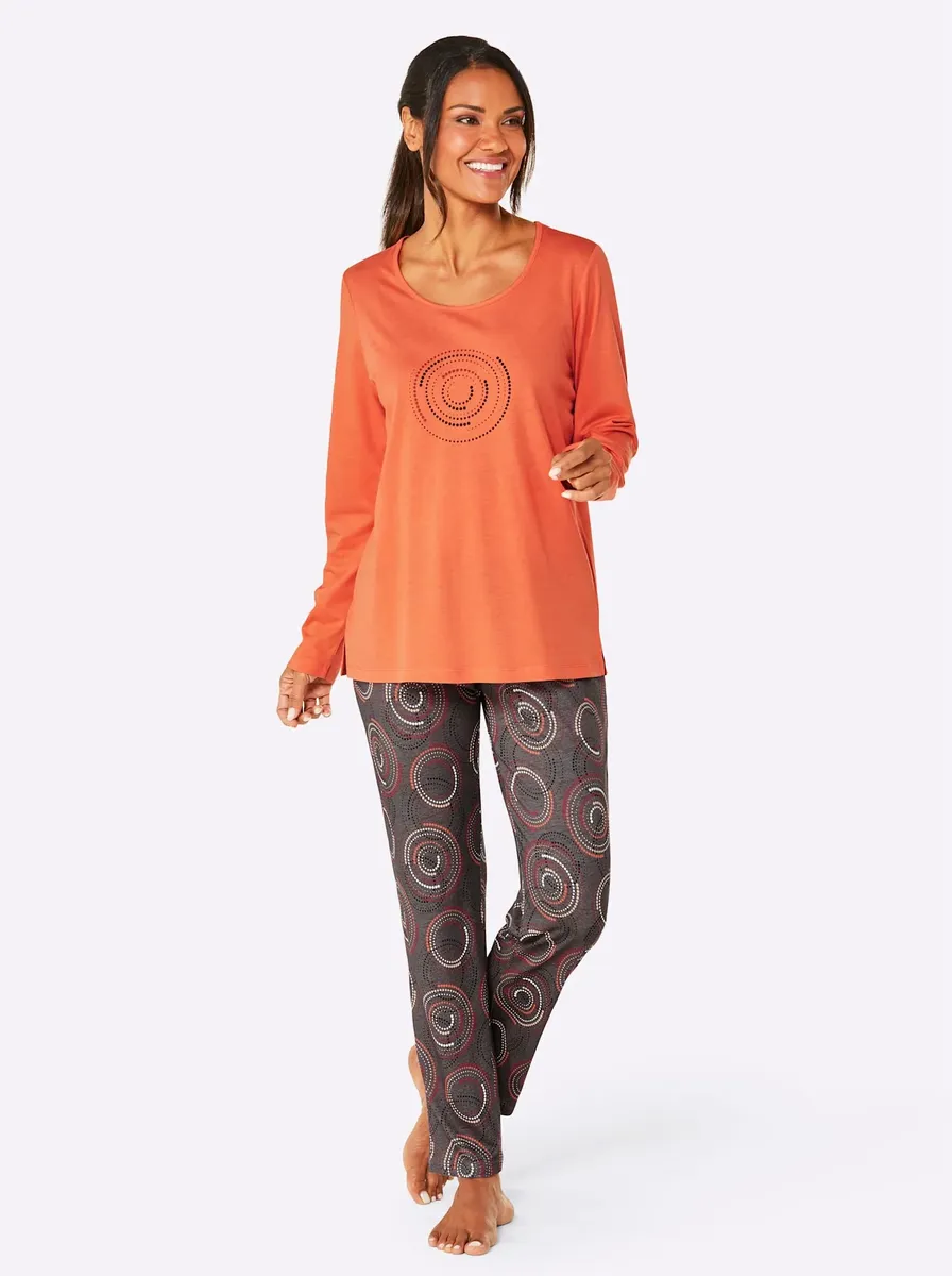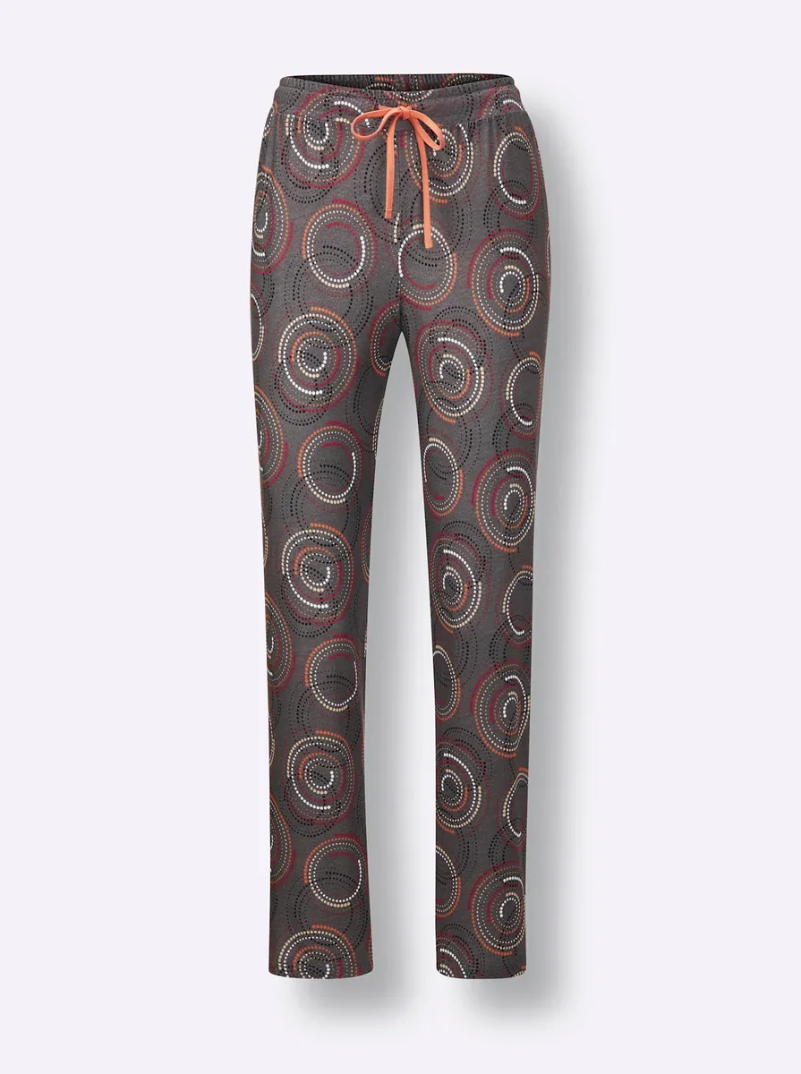 Уютная пижама из невероятно мягкого трикотажа. Топ с широким круглым вырезом, принтом и разрезами по бокам. Брюки с рисунком и поясом на кулиске. 50% хлопок, 50% модал.
