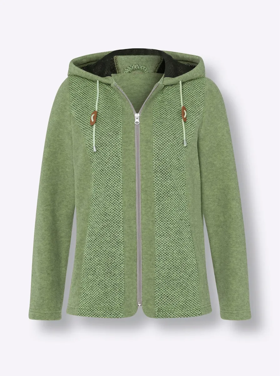 Уютная флисовая куртка с мягкими трикотажными флисовыми вставками. Капюшон с люверсами и завязками. Молния во всю длину и формирующие венские швы. 2 практичных кармана. 100% полиэстер. Подкладка: 100% полиэстер. Машинная стирка.