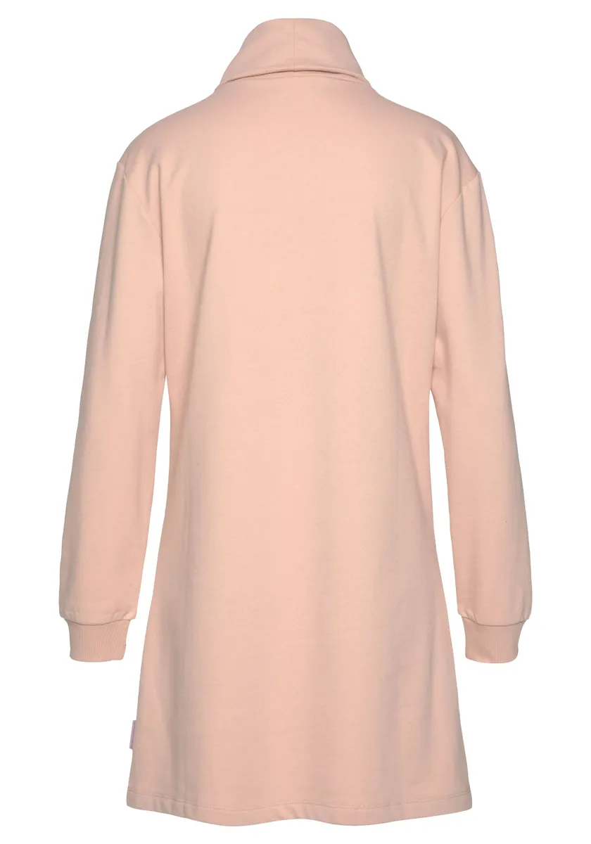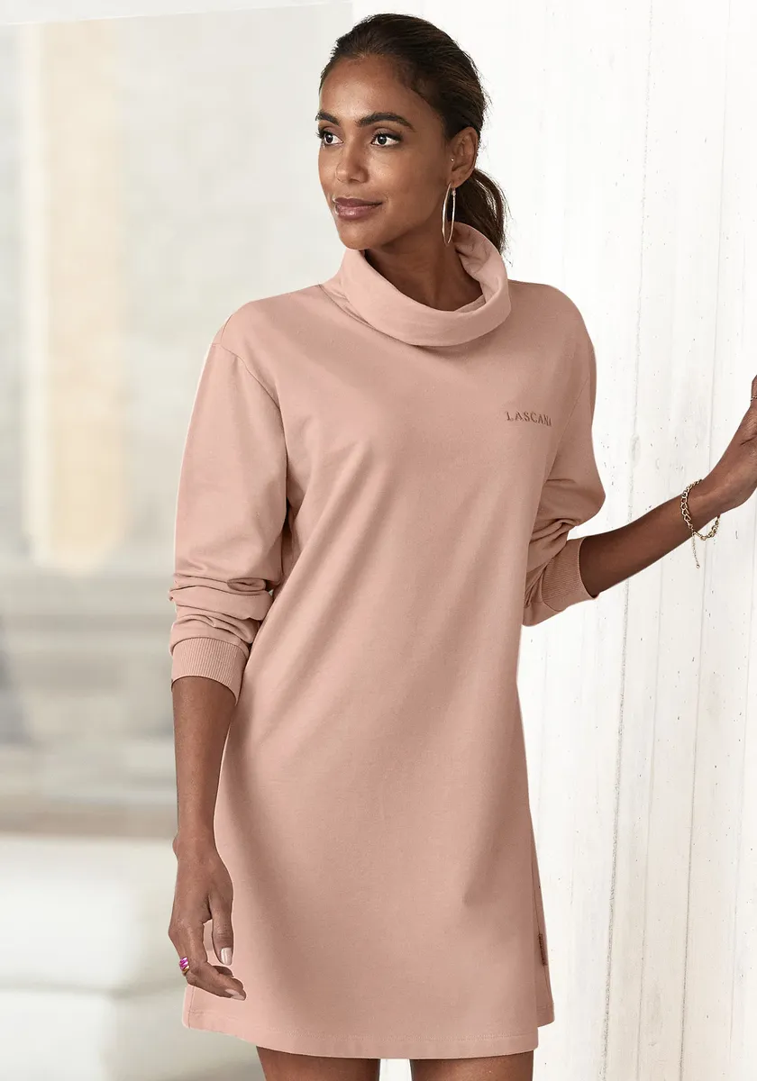 Уютное спортивное платье от Lascana. На груди вышит логотип бренда. С водолазкой и длинными рукавами. Широкие манжеты с эластичными свойствами. Модель облегает фигуру, слегка расклешенная к низу. Идеально подходит для отдыха. Мягкий свитер.