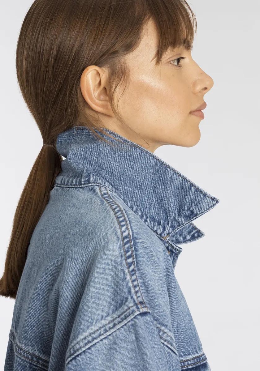 Женщины, которые хотят провести прохладные дни модно и уютно, не пренебрегая факторами стиля, могут выбрать джинсовую куртку от Levi's. Куртка с отложным воротником доходит до бедер и имеет чуть более широкий крой. Длинные рукава имеют манжеты. Мелкие предметы можно носить с собой в нагрудных карманах. Джинсовая куртка прочная и выдерживает множество стирок. Вы также можете использовать его, чтобы удобно посидеть в саду после захода солнца.