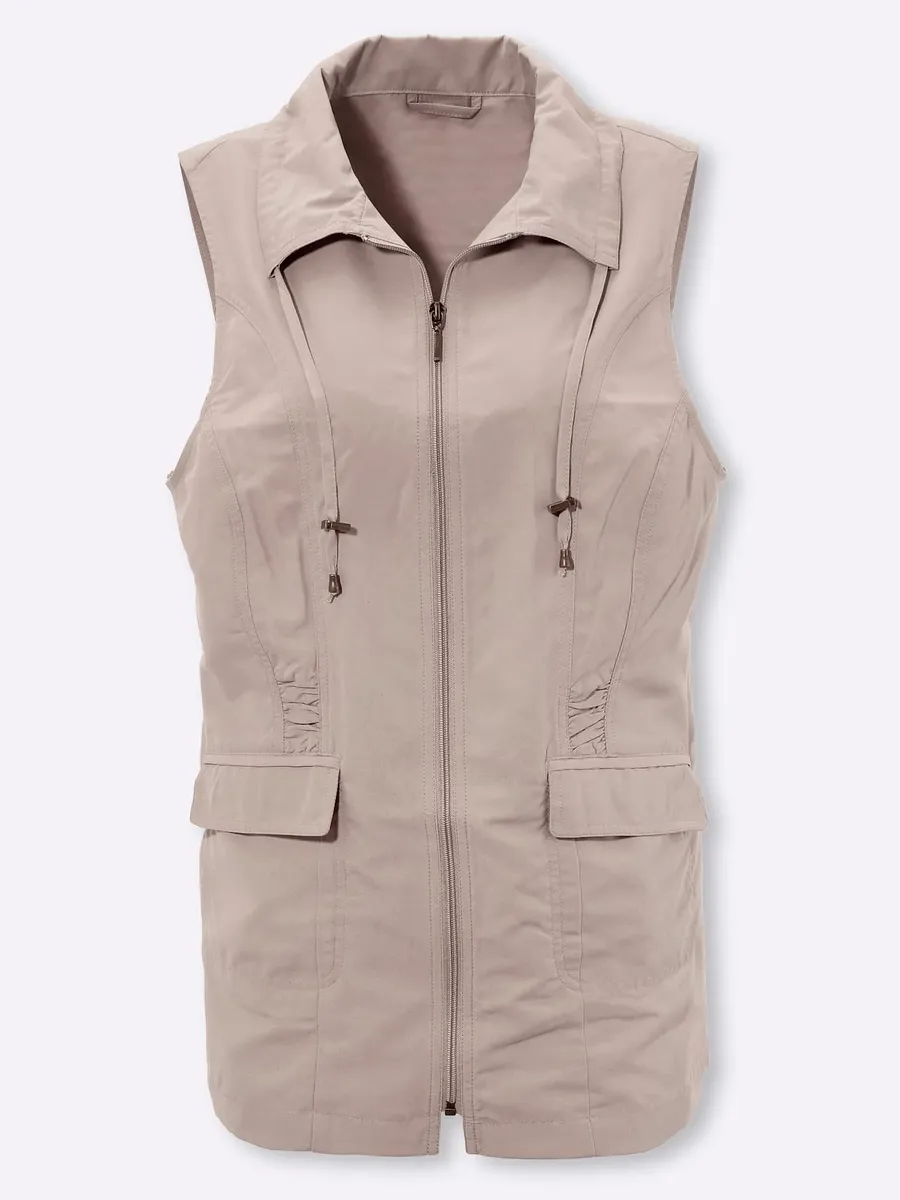 Жилет из легкой в ​​уходе микрофибры. С отложным воротником, потайными карманами на молнии и клапанами. Декоративная сборка между венскими швами. 100% полиэстер. Машинная стирка.