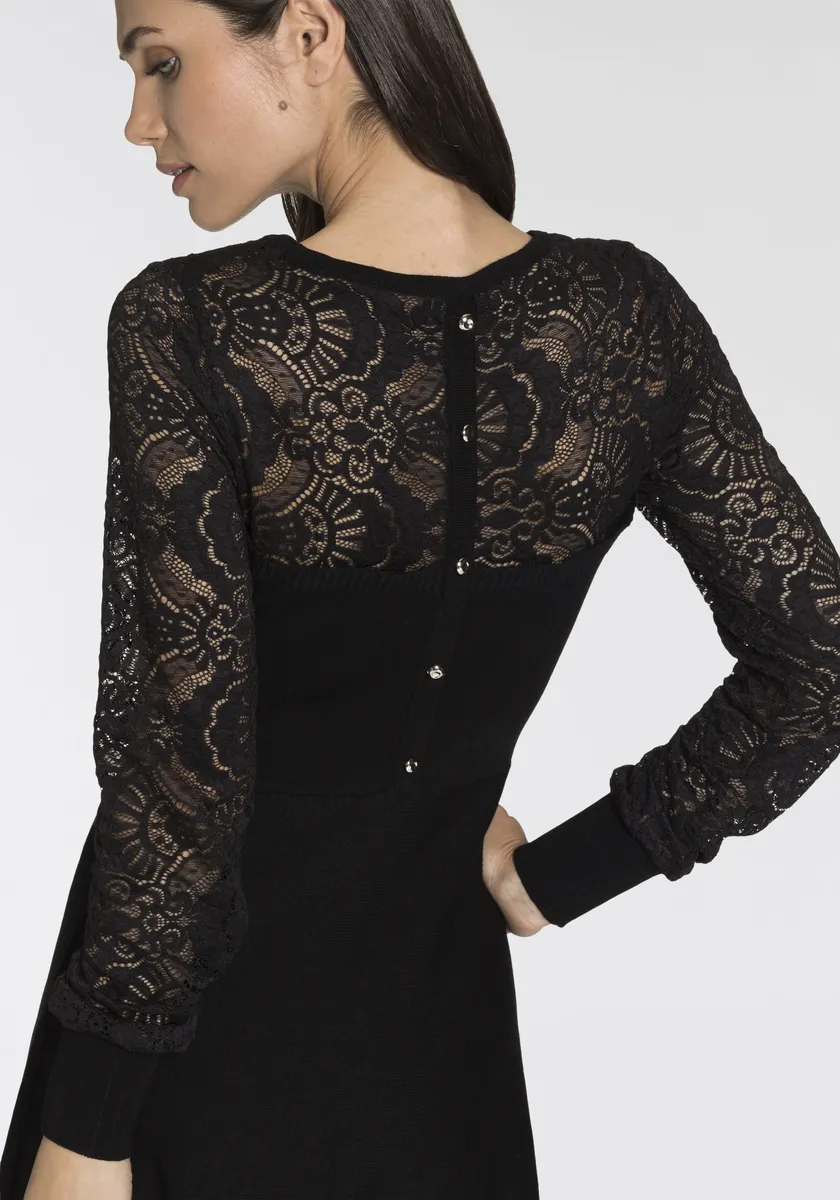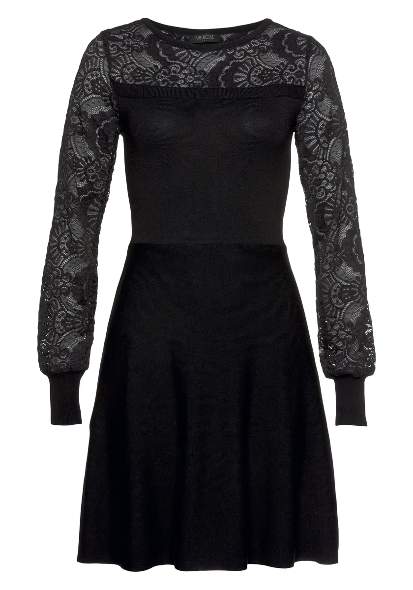 Это вязаное платье от Melrose – шикарная альтернатива брючному костюму! Шов на талии максимально подчеркивает силуэт. Благодаря кружевной ткани платье имеет игривый дизайн.