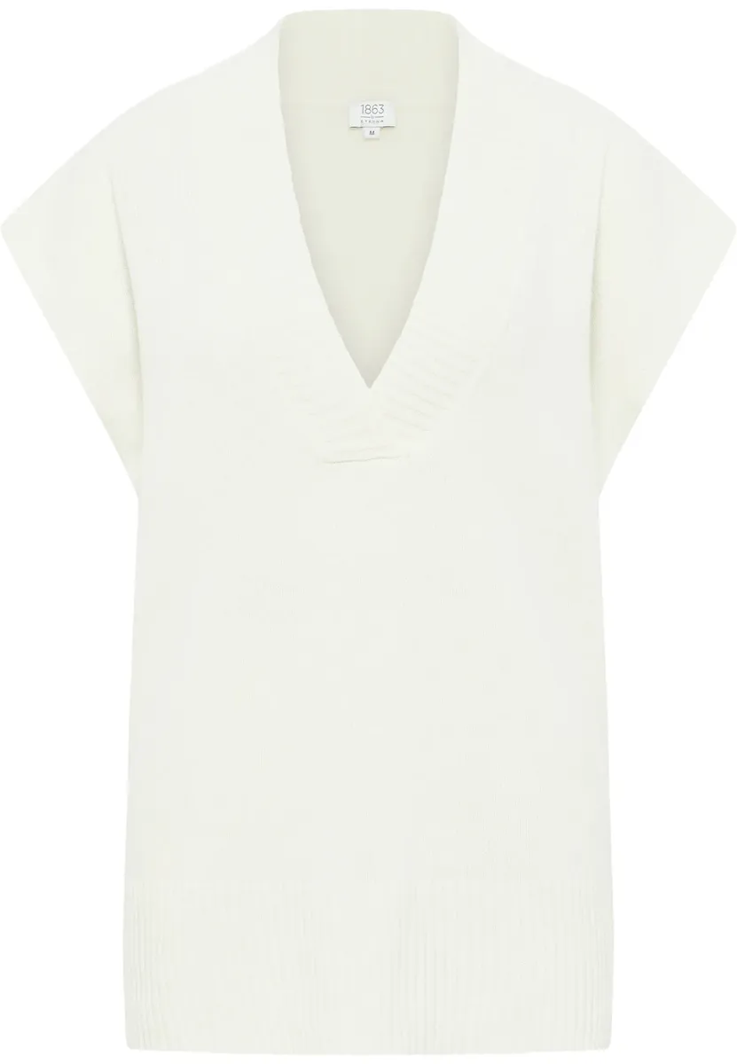 Вязаный женский жилет-свитер — популярная базовая вещь, которая идеально подходит для переходного периода. Высококачественная модель премиум-класса из 30 % кашемира и 70 % мериносовой шерсти обеспечит комфорт и уют. Наш вязаный свитер без рукавов дополнит ваш образ и подчеркнет элегантность вашего стиля. Его можно прекрасно вписать в современный модный наряд. Привлекательный вязаный узор на глубоком V-образном вырезе и боковом разрезе по низу особенно красиво подчеркивает внешний вид этого жилета-свитера. Закажите этот модный женский жилет-свитер в нашем магазине «1863». by ETERNA» сегодня «Премиум-коллекция.