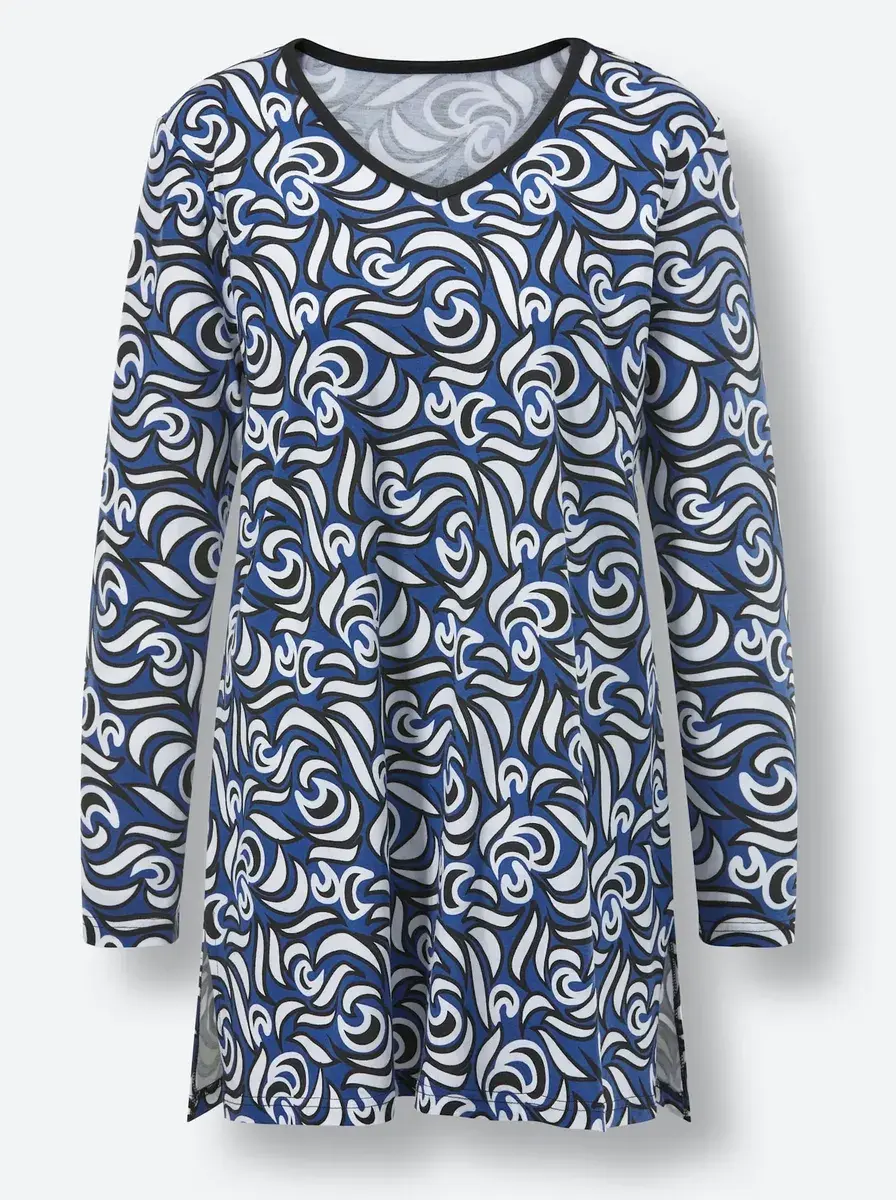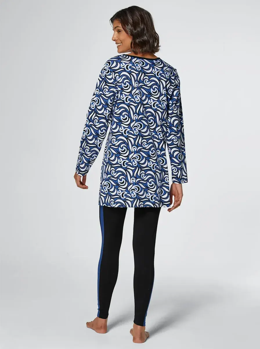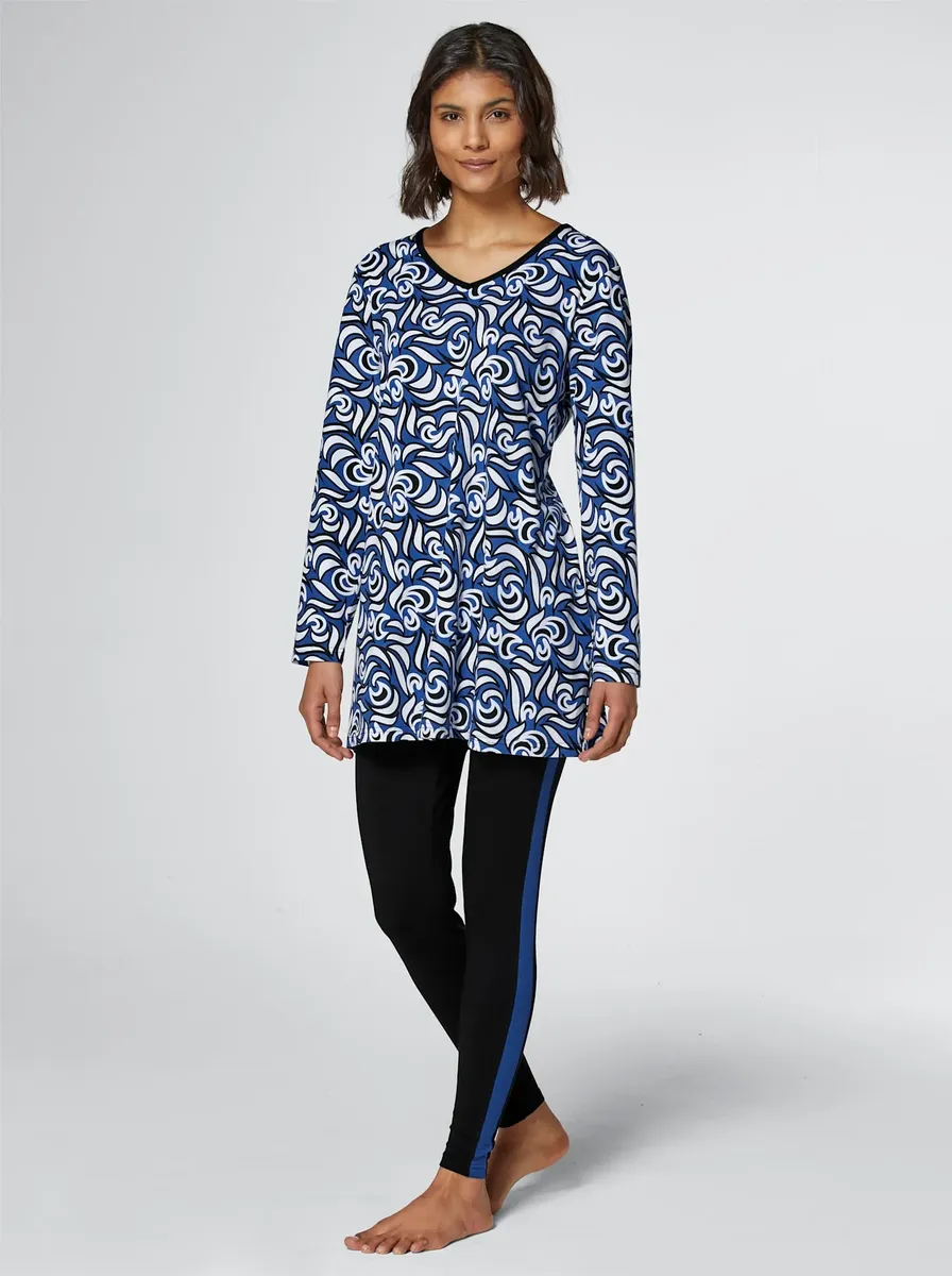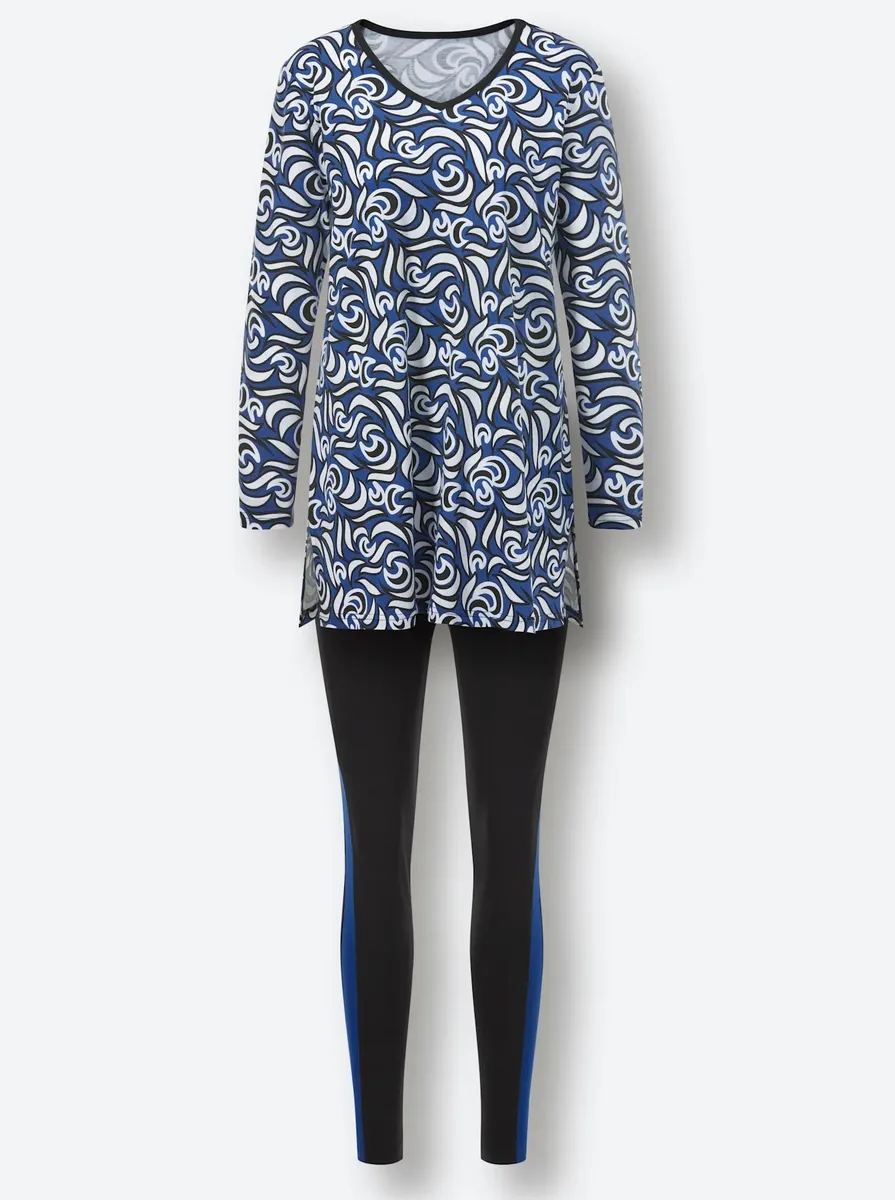 Фантастически красивая пижама из мягкого трикотажа. Топ с узором в стиле повседневной туники с окантованным V-образным вырезом. Леггинсы с оптически тянущимися галоновыми полосками по бокам. Верх: 50% хлопок, 50% вискоза. Леггинсы: 48% хлопок, 48% вискоза, 4% эластан.