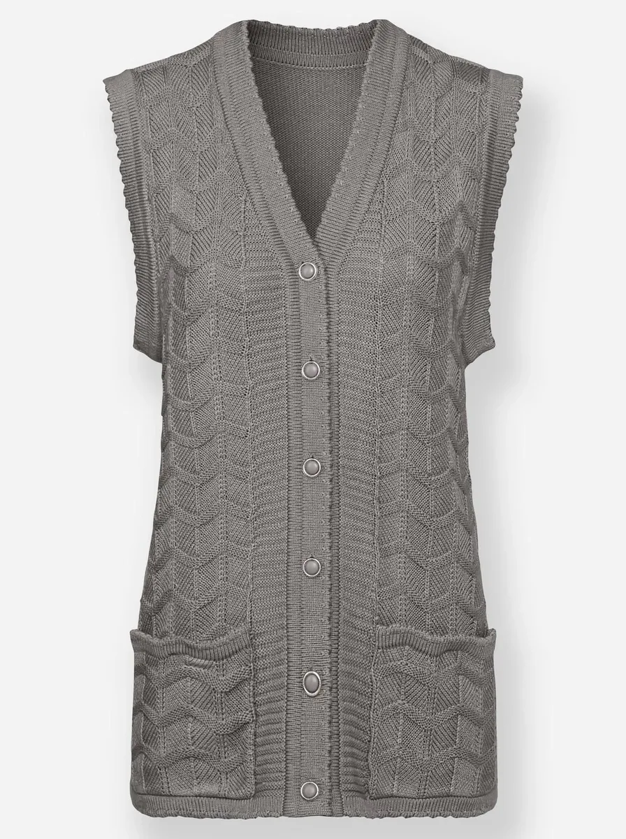 Вязаный жилет с вязаным узором спереди. V-образный вырез и планка с декоративными пуговицами. 2 накладных кармана. Волнистые концы. Аккуратно связала по форме. В приятном, мягком качестве. 100% полиакрил. Машинная стирка.