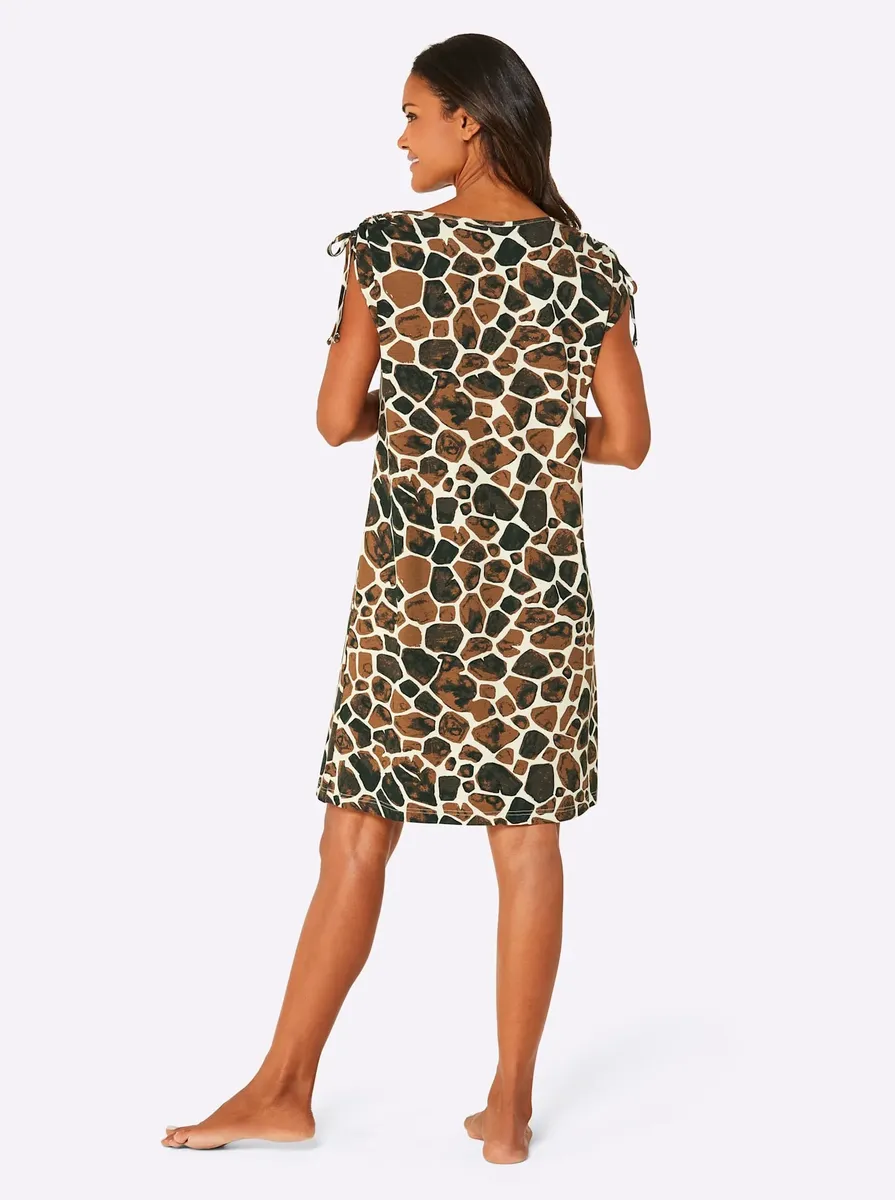 Это летнее платье привлекательного А-силуэта впечатляет принтом диких животных. Круглый вырез декорирован небольшим разрезом и декоративной застежкой. Небрежно перекройте плечи завязками. Изготовлен из вискозы качества ECOVERO от Lenzing. Одинарный трикотаж. 95% вискоза (ЭкоВеро), 5% эластан.