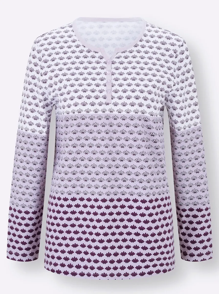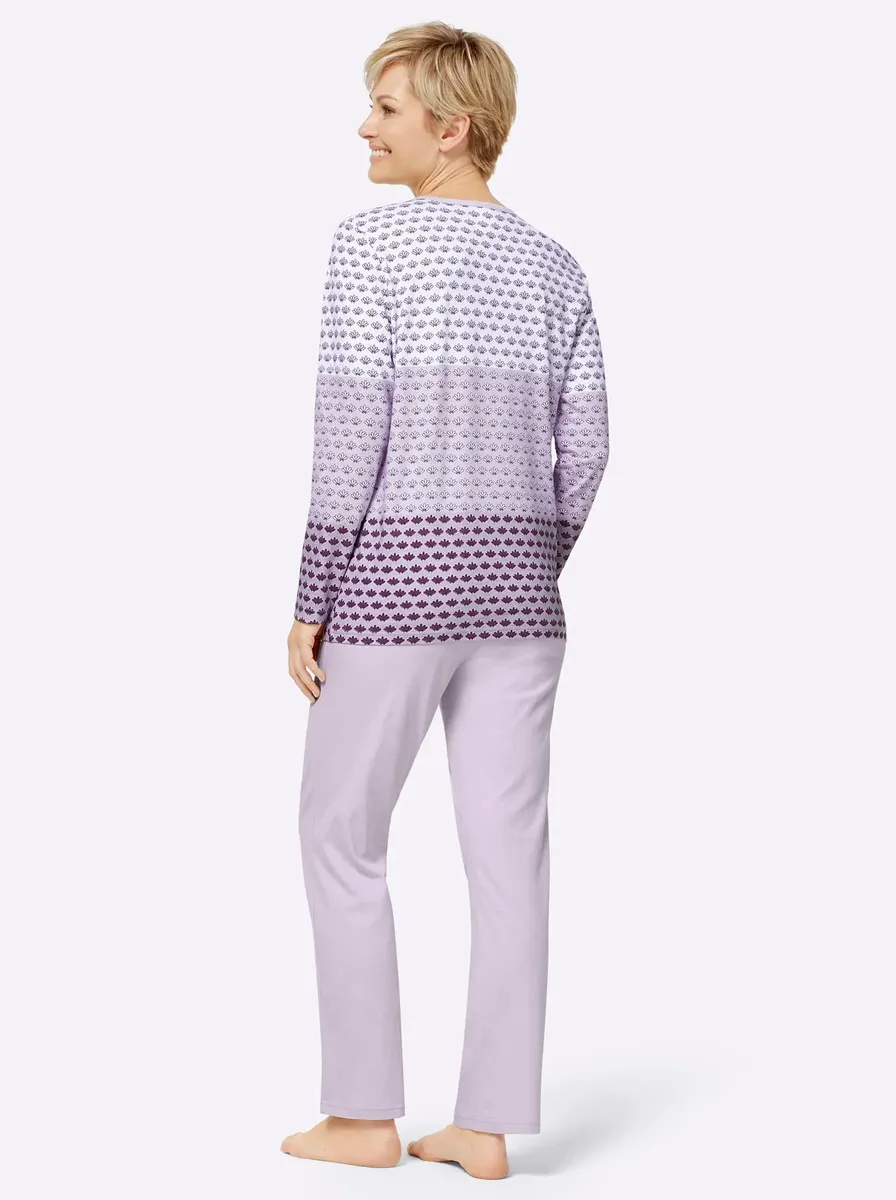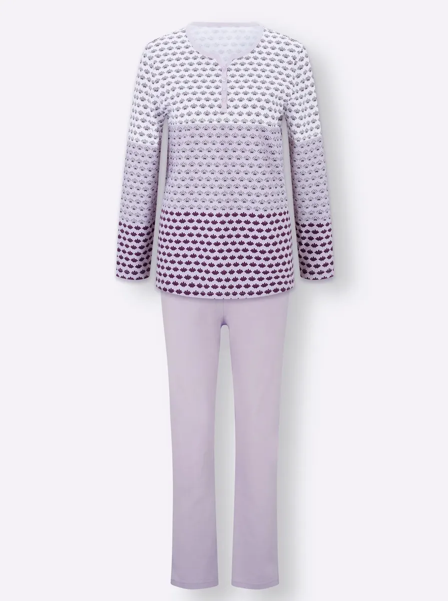Гармоничный цветовой градиент в сочетании с ярким сочетанием узоров: именно такое сочетание имеет значение в этой повседневной пижаме! Топ с круглым вырезом, небольшой буквой V и короткой планкой на пуговицах. Однотонные брюки с удобным эластичным поясом. Одинарный трикотаж. 100% хлопок.