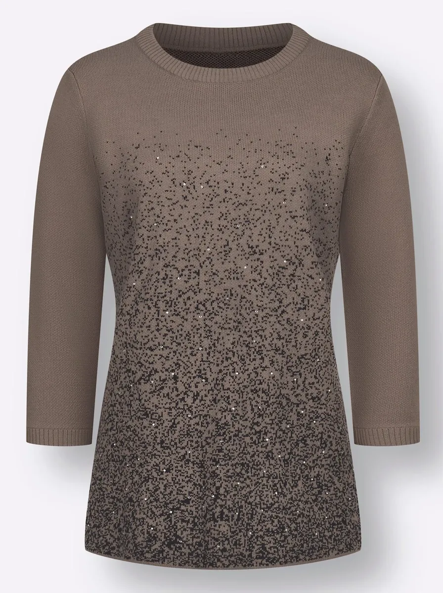 Гармоничный цветовой градиент с мелкими блестящими камнями привлекает внимание к этому свитеру. Изящный жаккардовый трикотаж с круглым вырезом. Модные рукава 3/4 с ребристыми манжетами. 100% полиакрил. Машинная стирка.