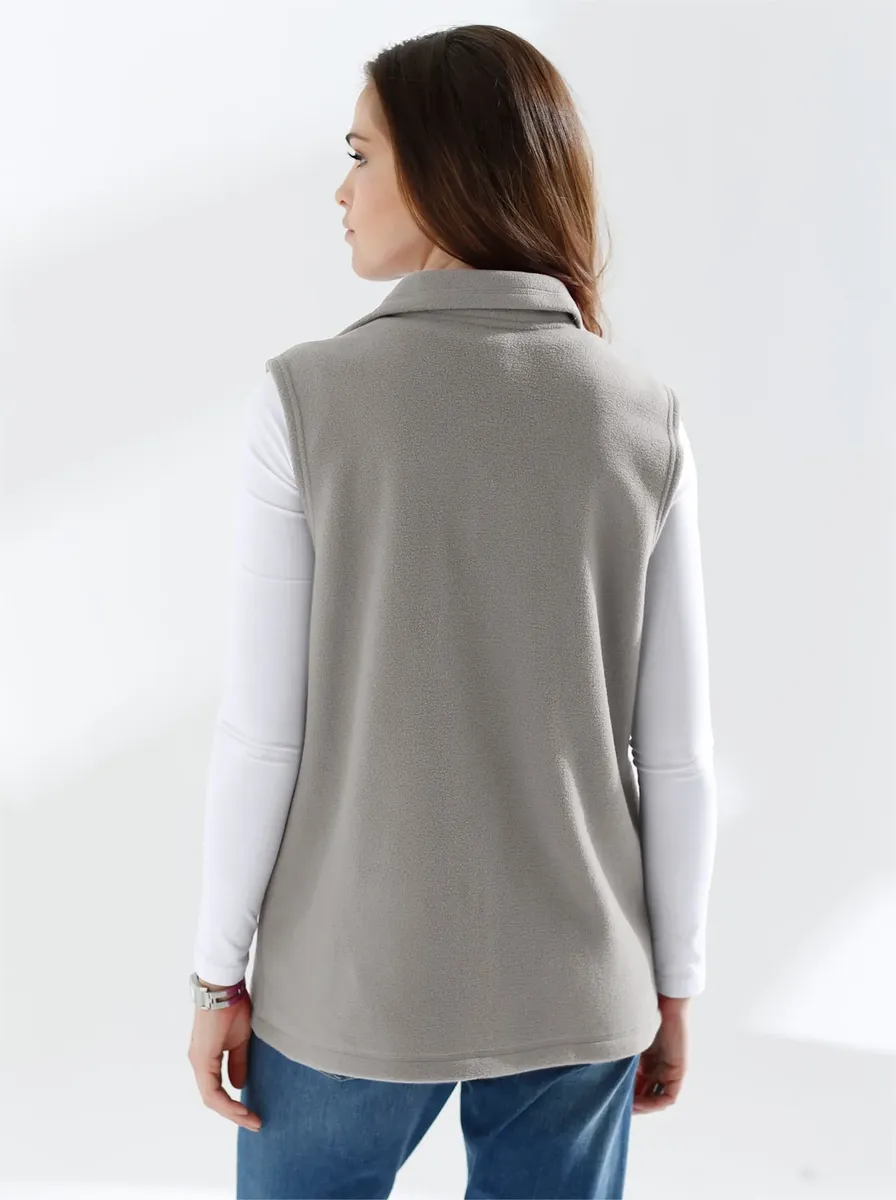 Флисовый жилет, пушистый и мягкий, с воротником-стойкой, молнией во всю длину, формирующими венскими швами и 2 карманами. С антипиллинговым оборудованием. 100% полиэстер. Машинная стирка.