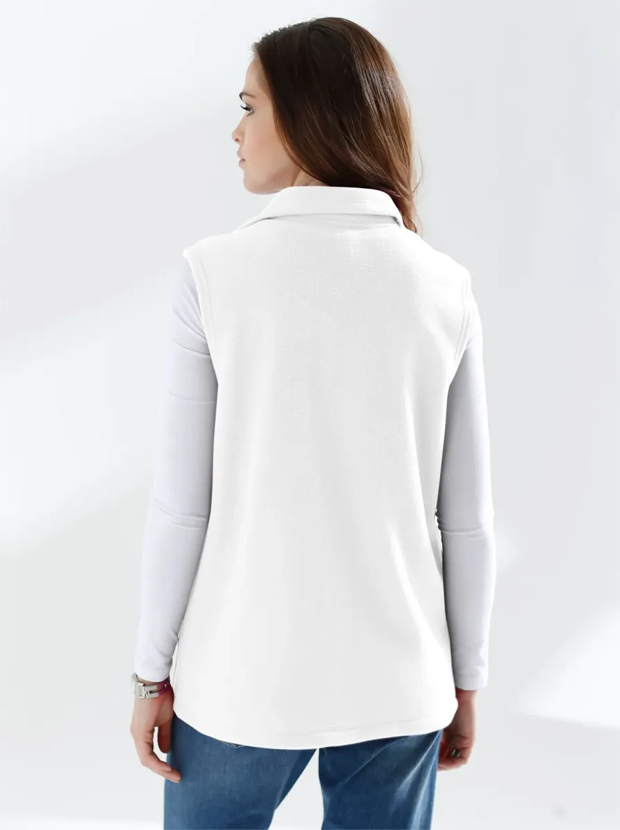 Флисовый жилет, пушистый и мягкий, с воротником-стойкой, молнией во всю длину, формирующими венскими швами и 2 карманами. С антипиллинговым оборудованием. 100% полиэстер. Машинная стирка.