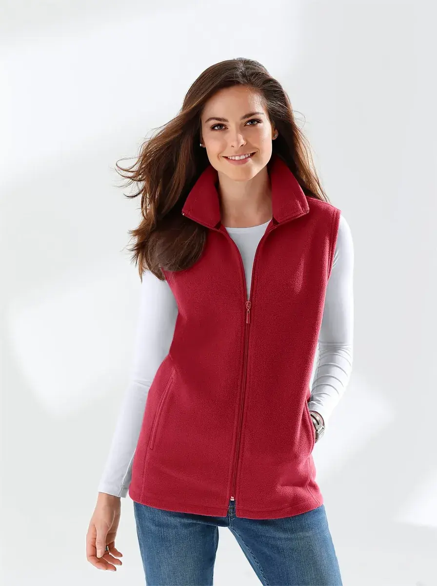 Флисовый жилет, пушистый и мягкий, с воротником-стойкой, молнией во всю длину, формирующими венскими швами и 2 карманами. С антипиллинговым оборудованием. 100% полиэстер. Машинная стирка.