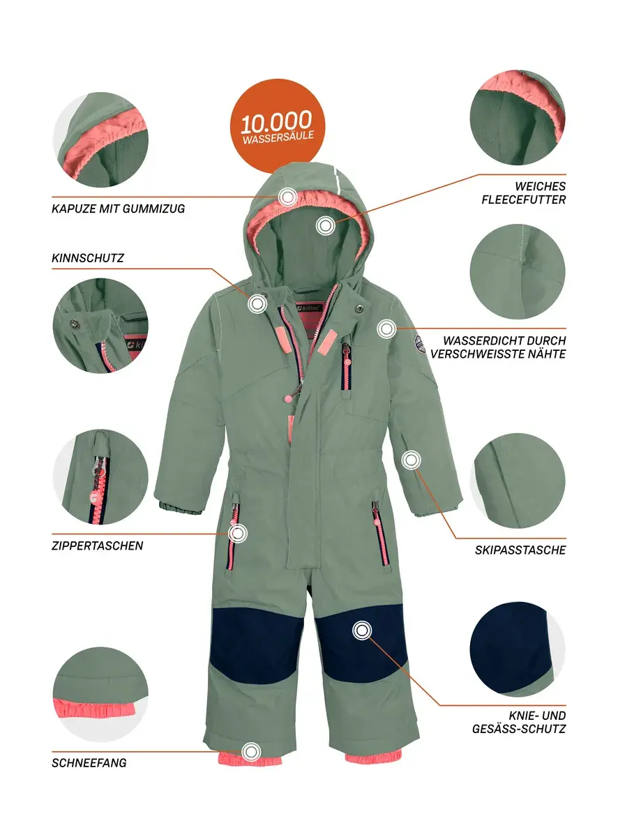 Комбинезон killtec для самых маленьких впечатляет ярким дизайном с цветными блоками и практичными функциями. Имеет капюшон с внутренней эластичной кромкой и 100% водонепроницаемость благодаря сварным швам и водяному столбу 10 000 мм. Снегозащиты на манжетах ног защищают от проникновения влаги. Мягкий флис внутри сохраняет тепло и уют. Эластичная талия и эластичные манжеты обеспечивают удобную посадку. Потайная молния имеет защиту подбородка, предотвращающую защемление кожи. Три кармана закрываются на молнии, чтобы ничего не потерялось. Комбинезон также оснащен модными светоотражающими элементами.